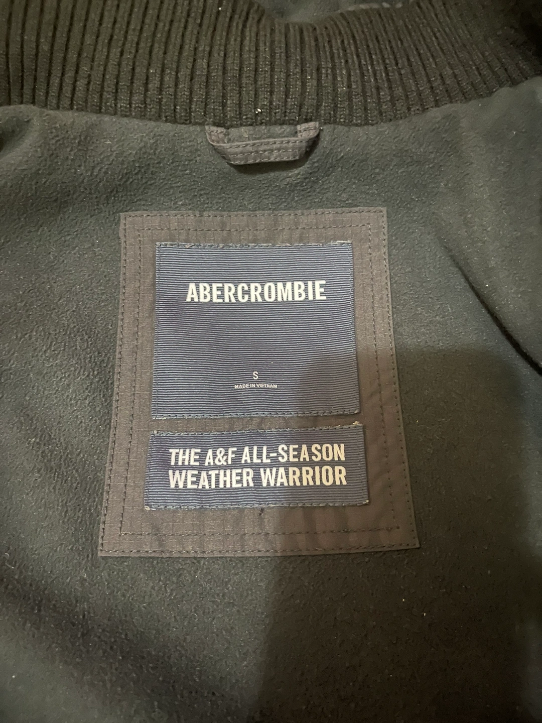 Black hooded jacket with a zipper and button closure. The jacket has a drawstring at the waist. The tag says size S and "The A&F All-Season Weather Warrior."