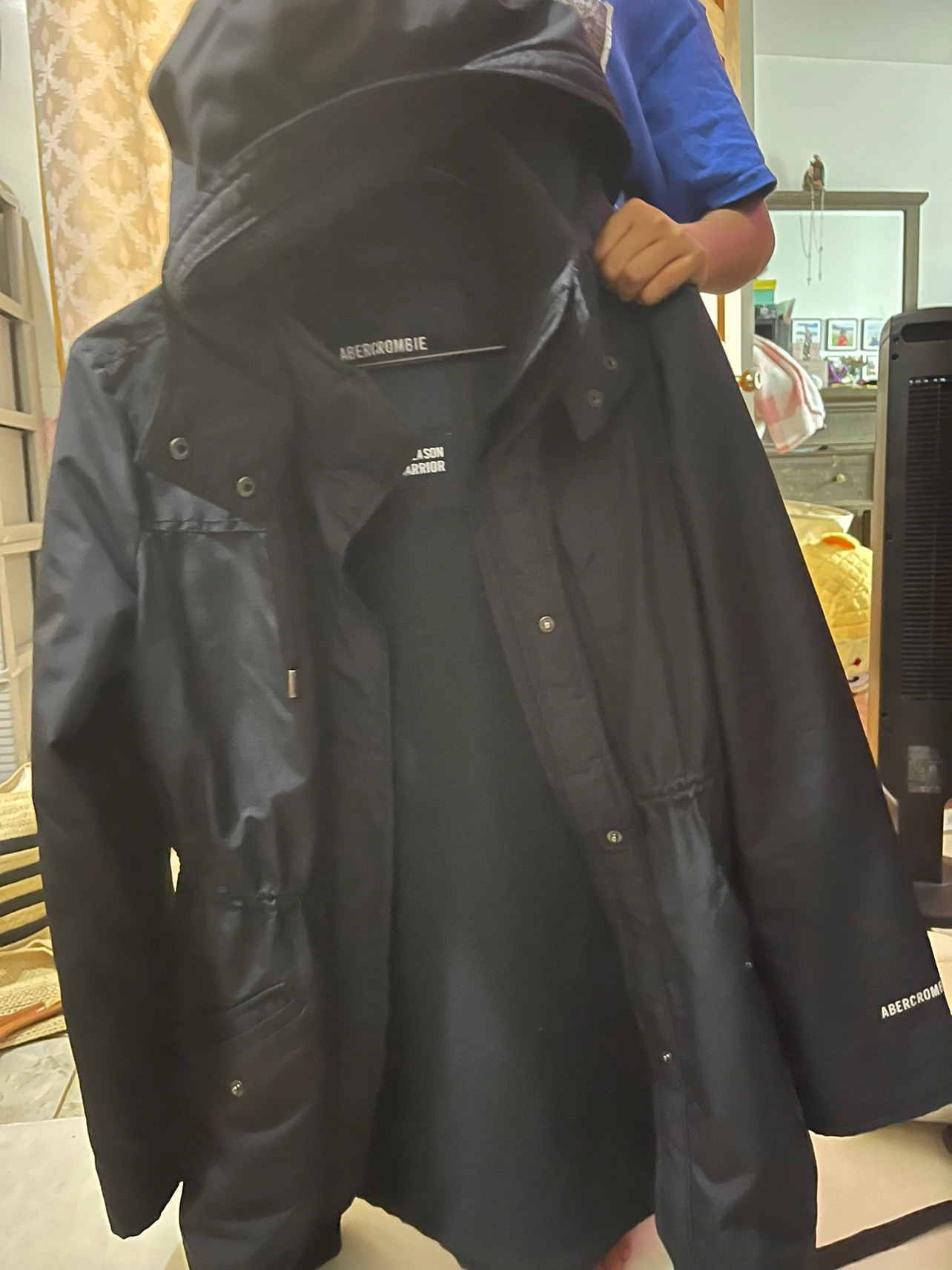 Black hooded jacket with a zipper and button closure. The jacket has a drawstring at the waist. The tag says size S and "The A&F All-Season Weather Warrior."