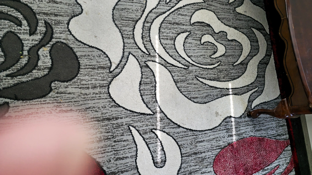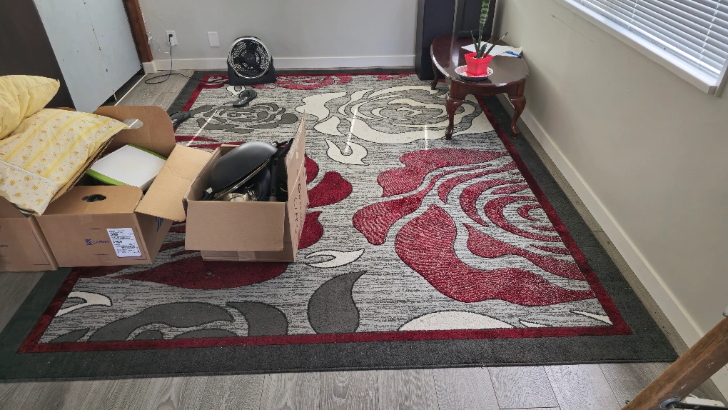 Large area rug with a grey, white and red floral design. The rug has a dark red border. Pick up on the 29th as I'am still on the process of packing & moving, I will have it vacuum , there's a small stain, that two bright white line is a light coming from the close blinds not a stain , check the 2nd pix. Thanks!