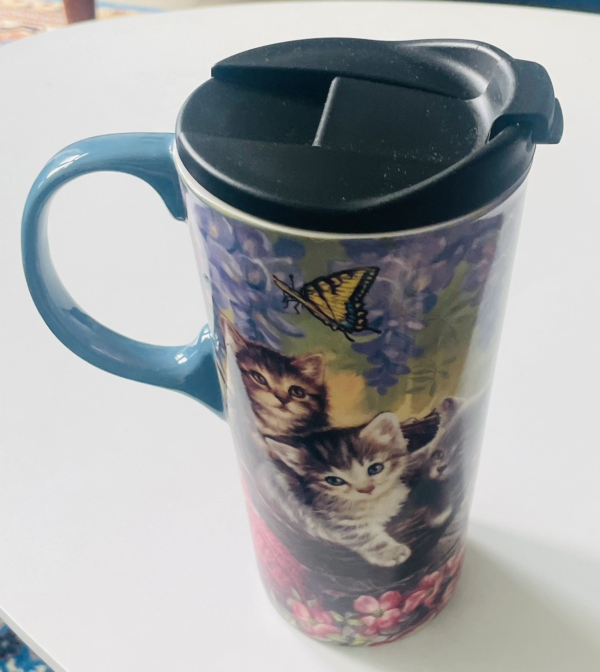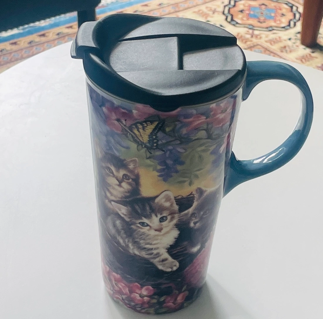 244This ceramic travel mug features a floral design with kittens. It has a blue handle and a black lid with a spout. The mug has a capacity of approximately 16 ounces.