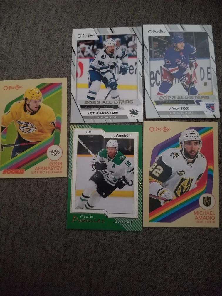 78Set of five hockey cards, including Erik Karlsson, Adam Fox, Joe Pavelski, Egor Afanasyev, and Michael Amadio.