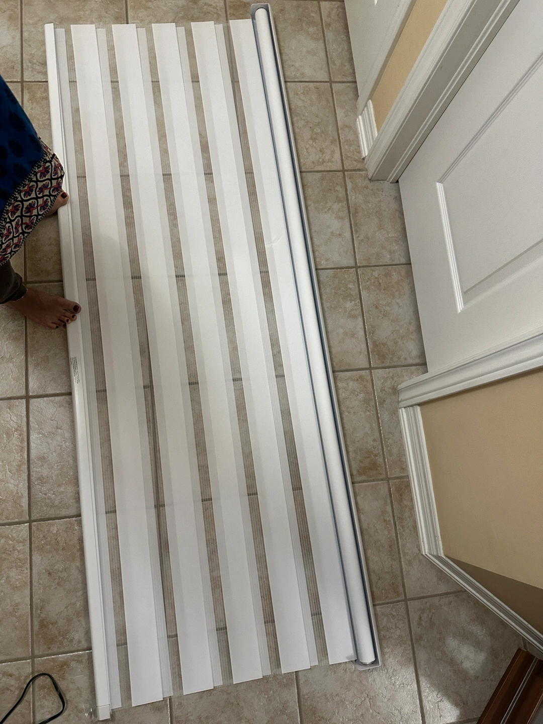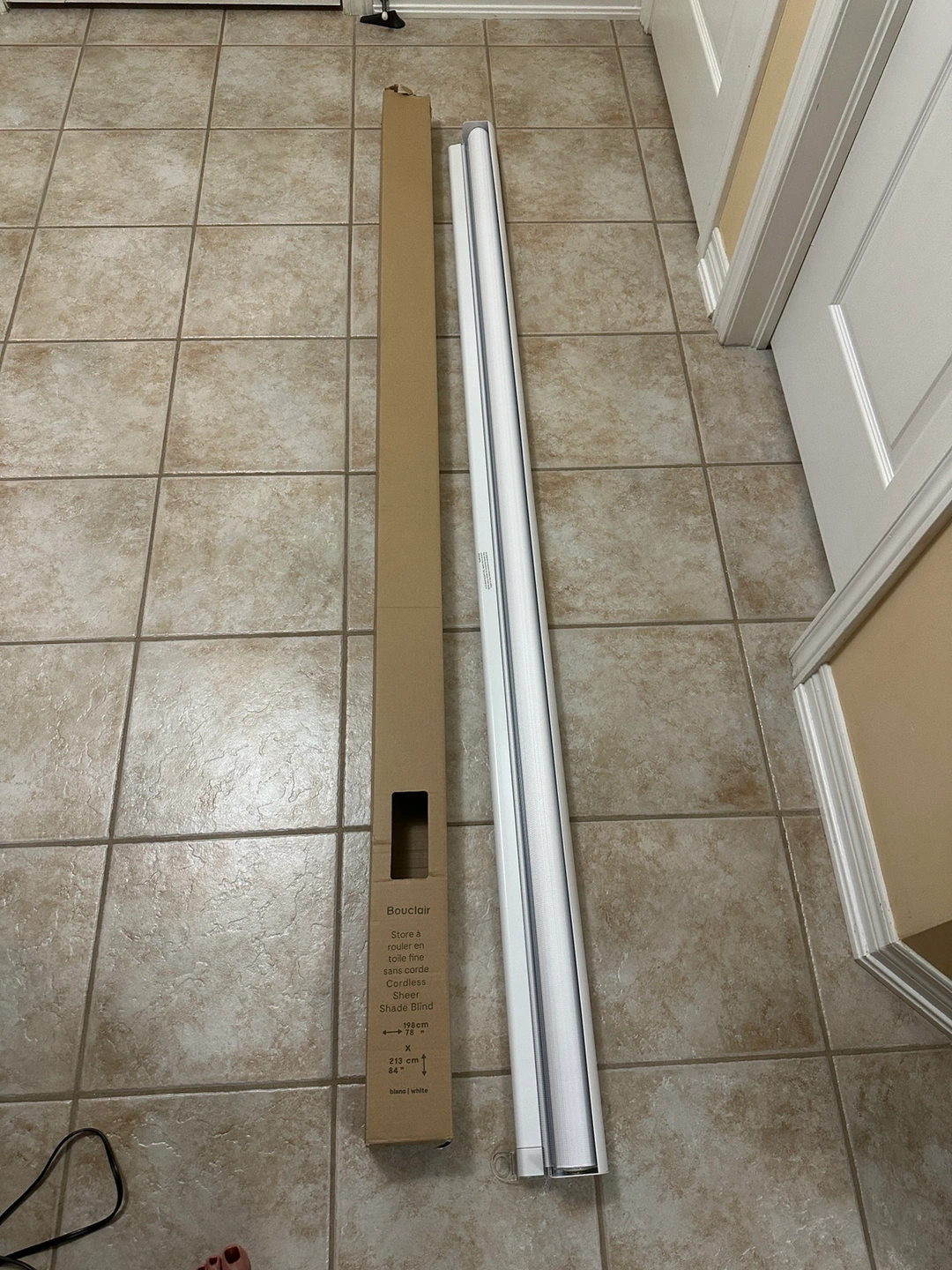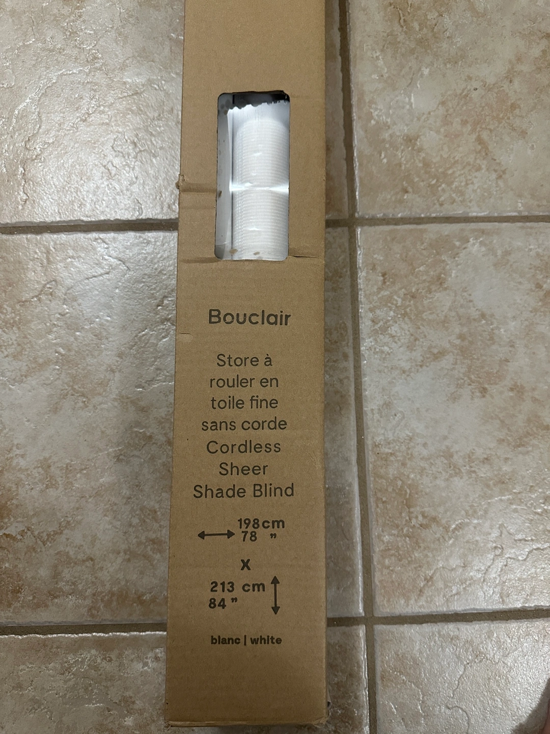 100White sheer shade blind in good condition. 78”inches wide x 84” inches high.It can be controlled with the pull cord mechanism and also with an optional remote control (sold separately). This shade is cordless. It is perfect for providing privacy and filtering the light.