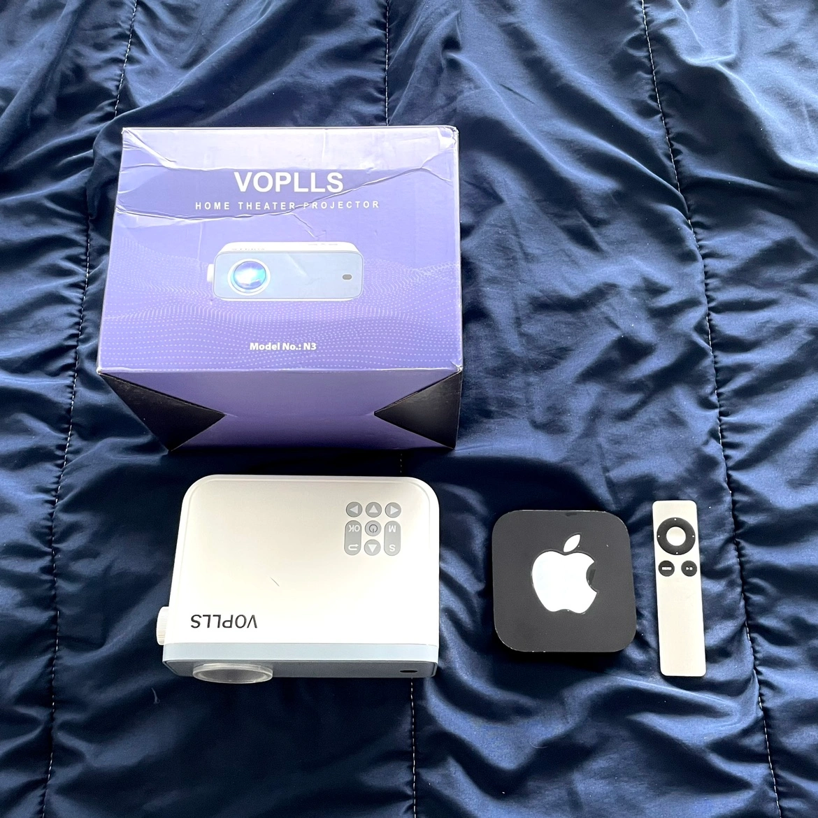 The projector comes with a remote control and an Apple TV. The projector is white and the box is purple. It appears to be a home theatre projector and it's model number is N3.