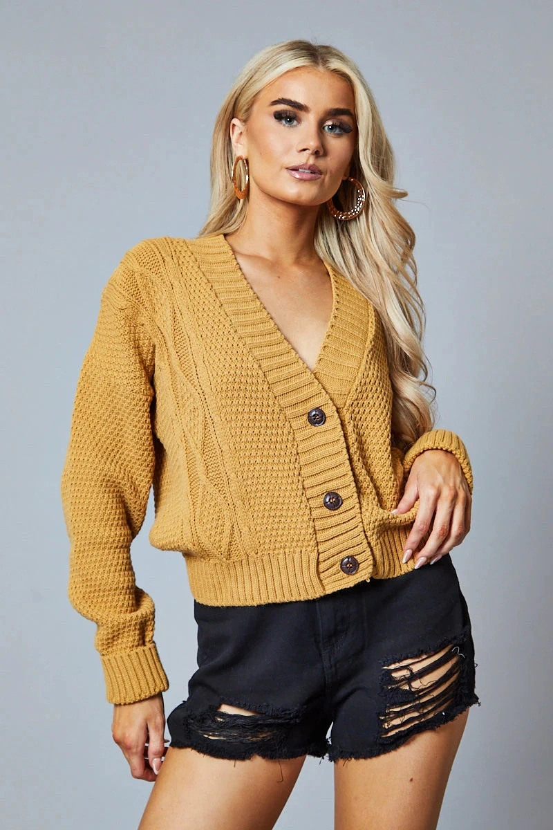 Long sleeve, V neck cardigan with button closure. Knitted in a cable stitch pattern.