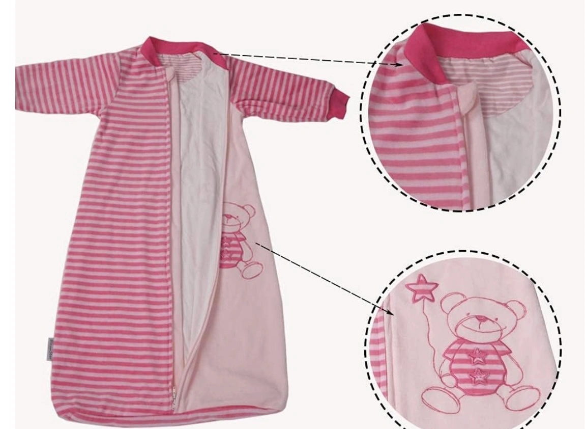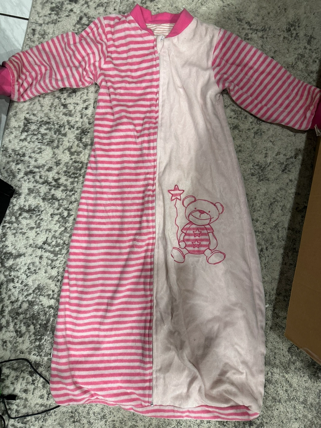 Pink and white striped sleep sack with a bear design on the front. It is 2.0 Tog and has long sleeves.