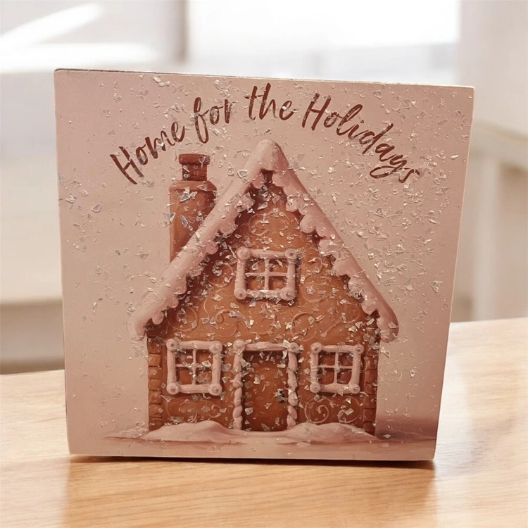 NEW wooden box sign featuring "Home for the Holidays" sentiment with a snow covered gingerbread house. The snow looks like it is falling and is placed on top of the exisiting painted picture. There is a distressed look on the corners of the box. This is in beautiful pink and brown tones and complements well with existing decor or coordinating design pieces. Easy to hang or can free-stand alone on a shelf or mantel.