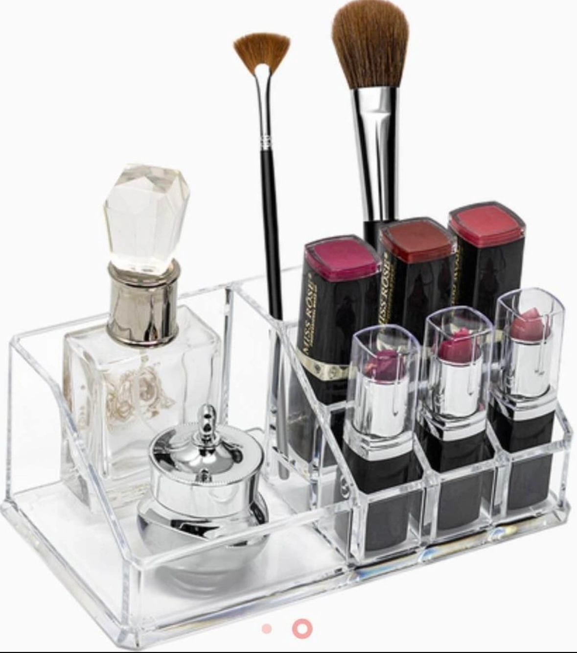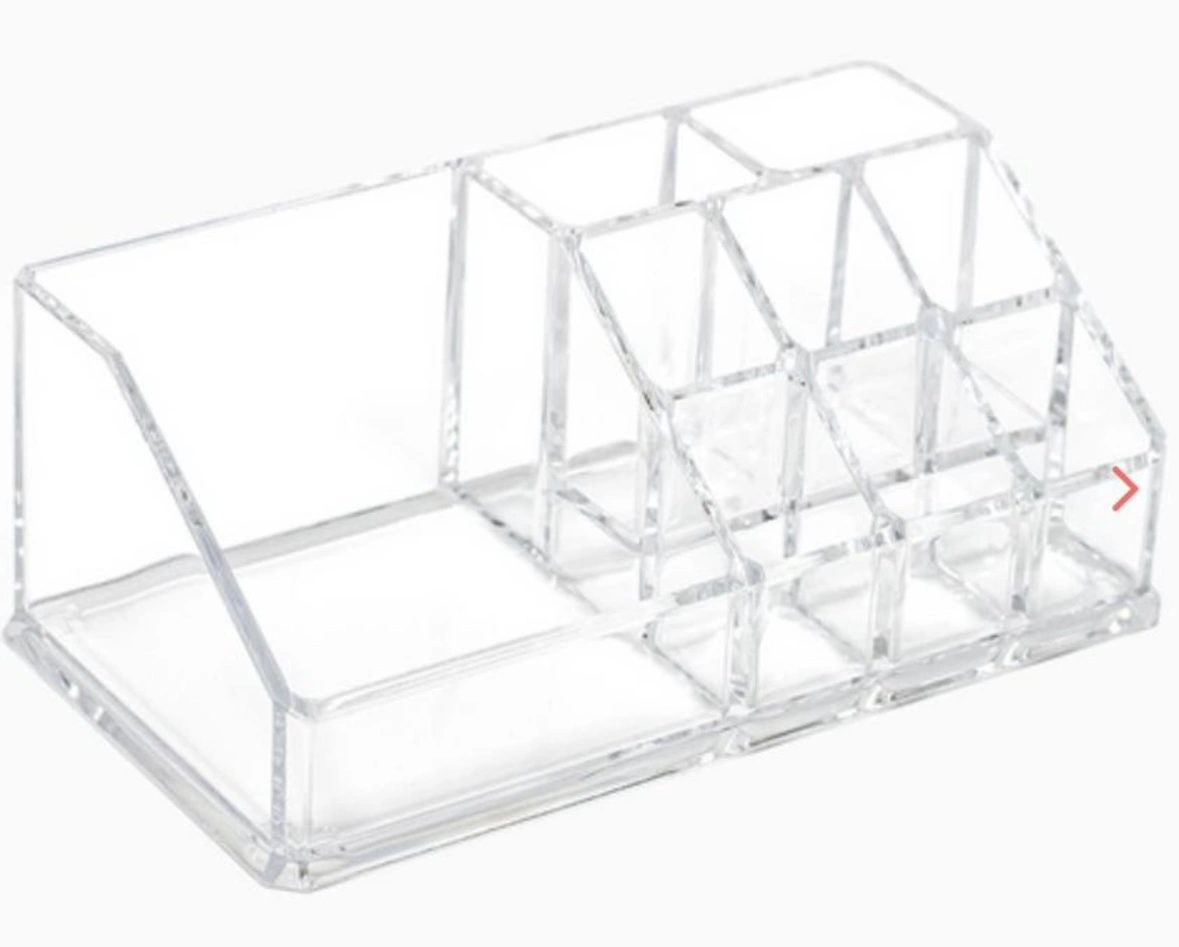 A clear acrylic organizer with multiple compartments to organize your makeup. It includes a large compartment for a bottle of perfume, a small compartment for a small jar, and several compartments for lipsticks. DIMENSIONS