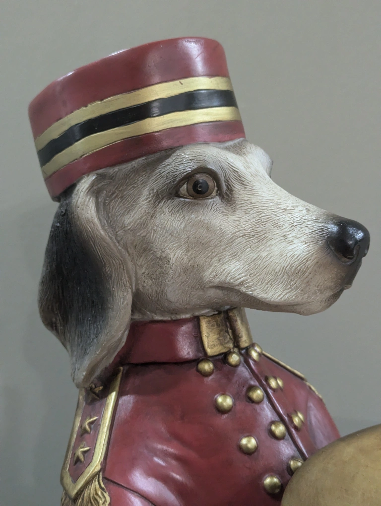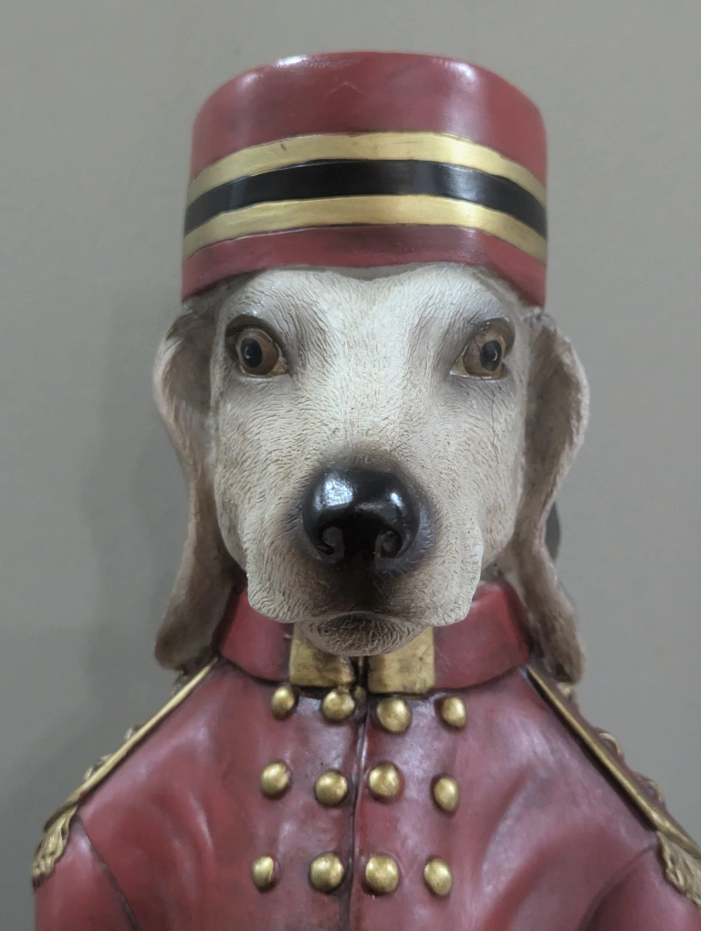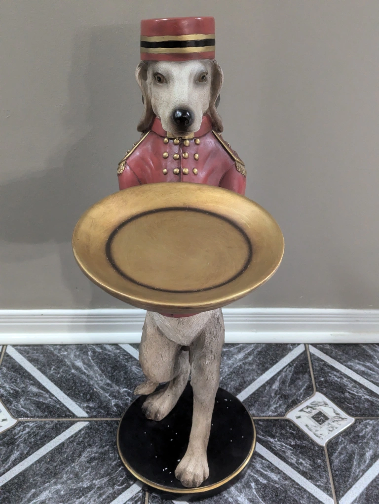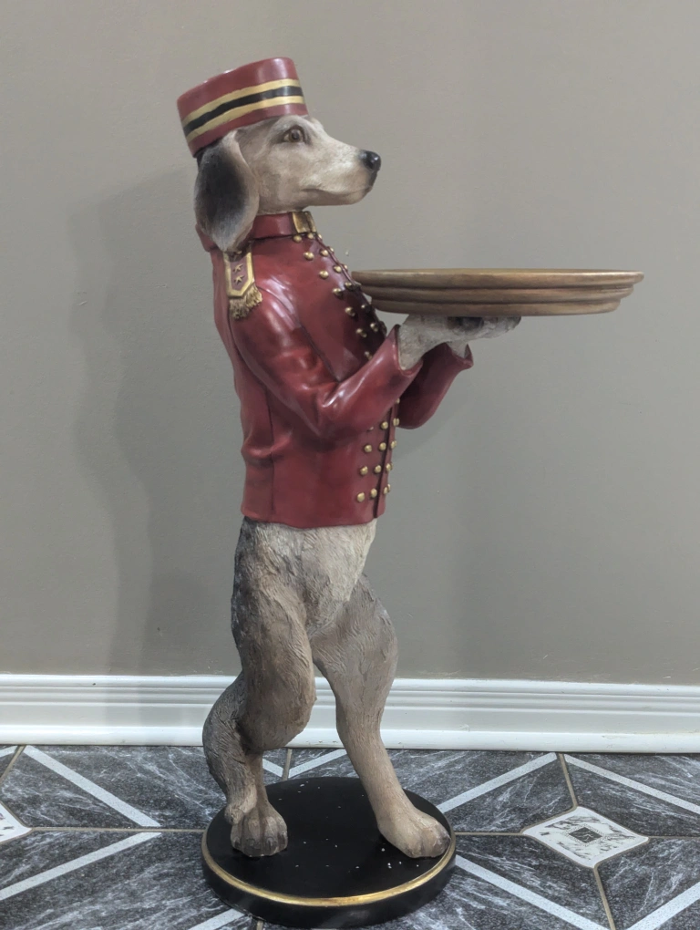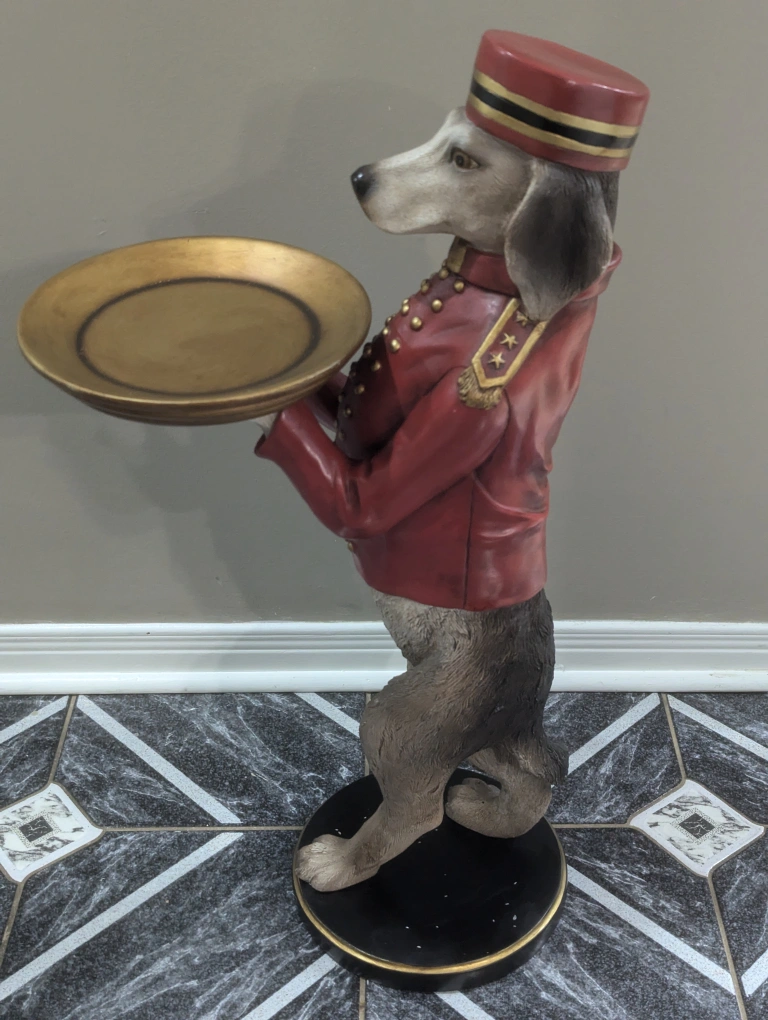 A beautiful and rare piece in excellent condition. This 31" tall Dudley the Bellhop Dog Doorman Butler Statue from the Bombay Company comes complete with a tray, making it a unique and striking addition to any space.