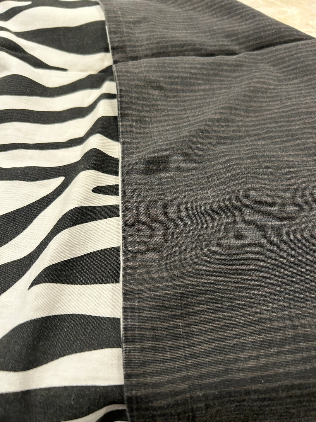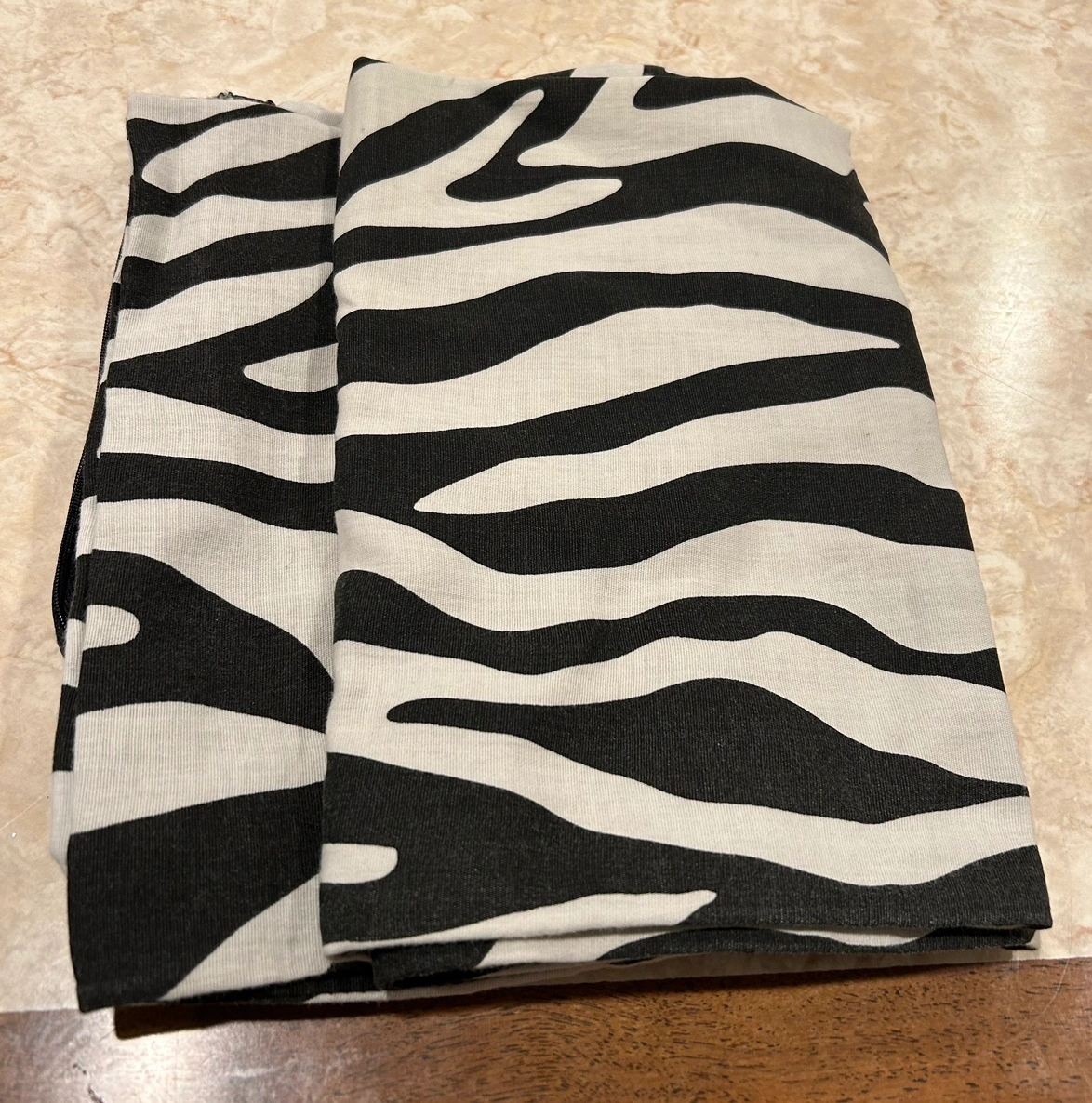 1000+These pillow shams are made of a soft and stretchy fabric. They have a zebra print, a black zipper and dark gray back.
