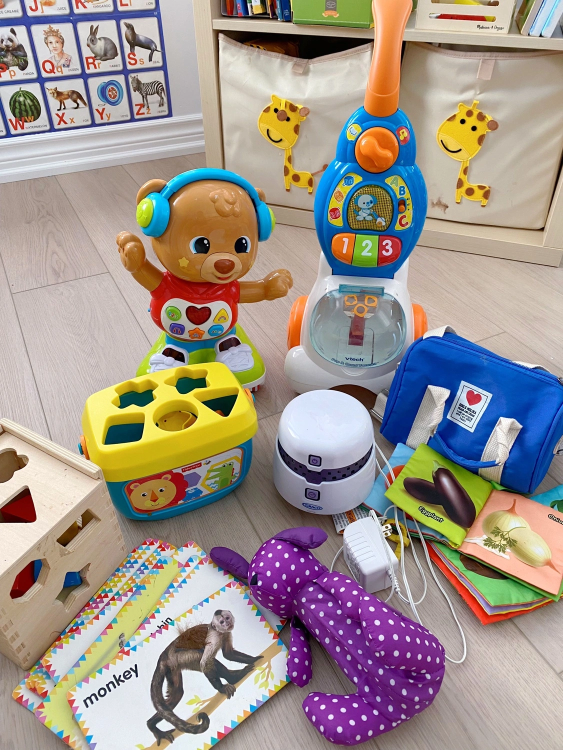 77A variety of toys including a toy vacuum, a dancing bear, a shape sorter, a wooden block set, a comforter sleeping sound machine and an umbrella and a bag. All electronic items are all working well.
