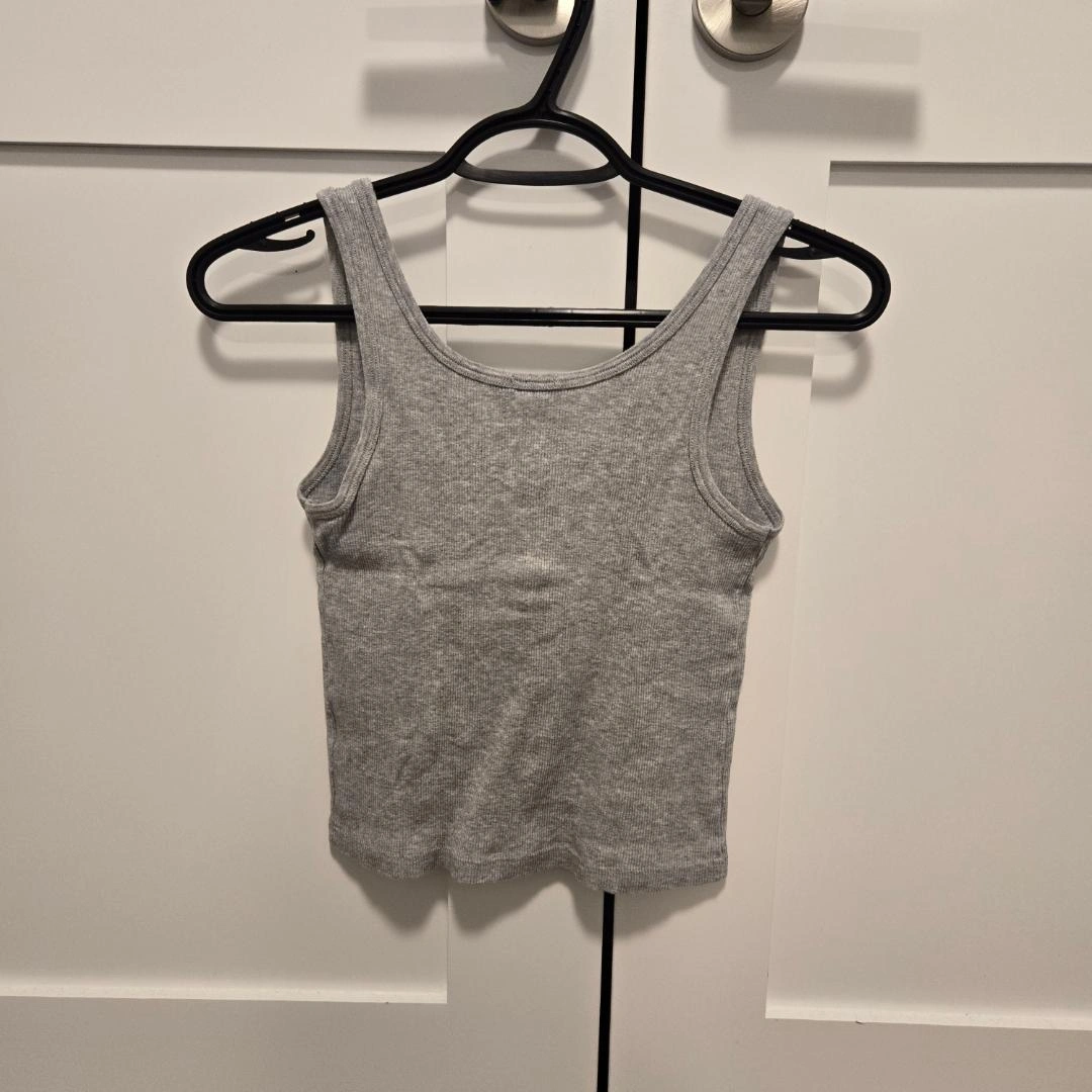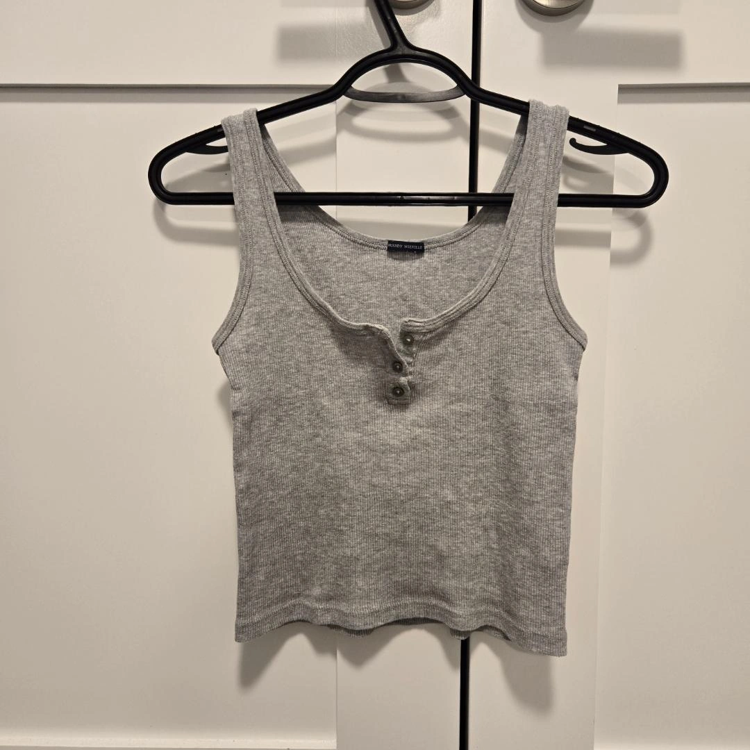Grey ribbed tank top with a button detail. The top is cropped and fits snugly. It is a great basic piece to wear with jeans or shorts.