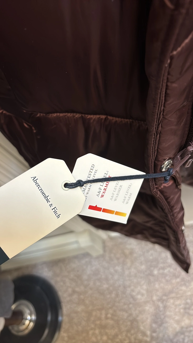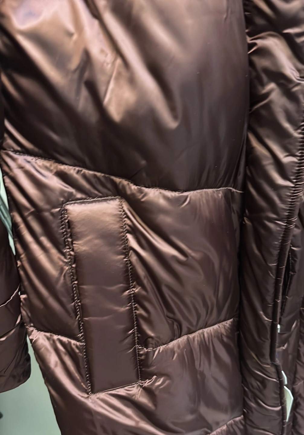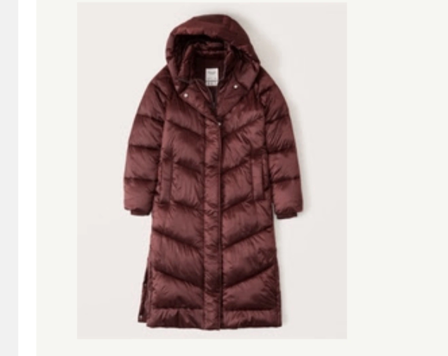 A shiny burgundy long puffer jacket with a hood. Size large. The jacket has a zipper and snap closure. It has two pockets on the front, one on the left side and one on the right side. The jacket is warm It’s long so would fit someone 5 7 or taller for a better fit Good for the winter It was 260 plus tax but I didn’t wear it as I had another one that I wore No try ons Serious buyers only