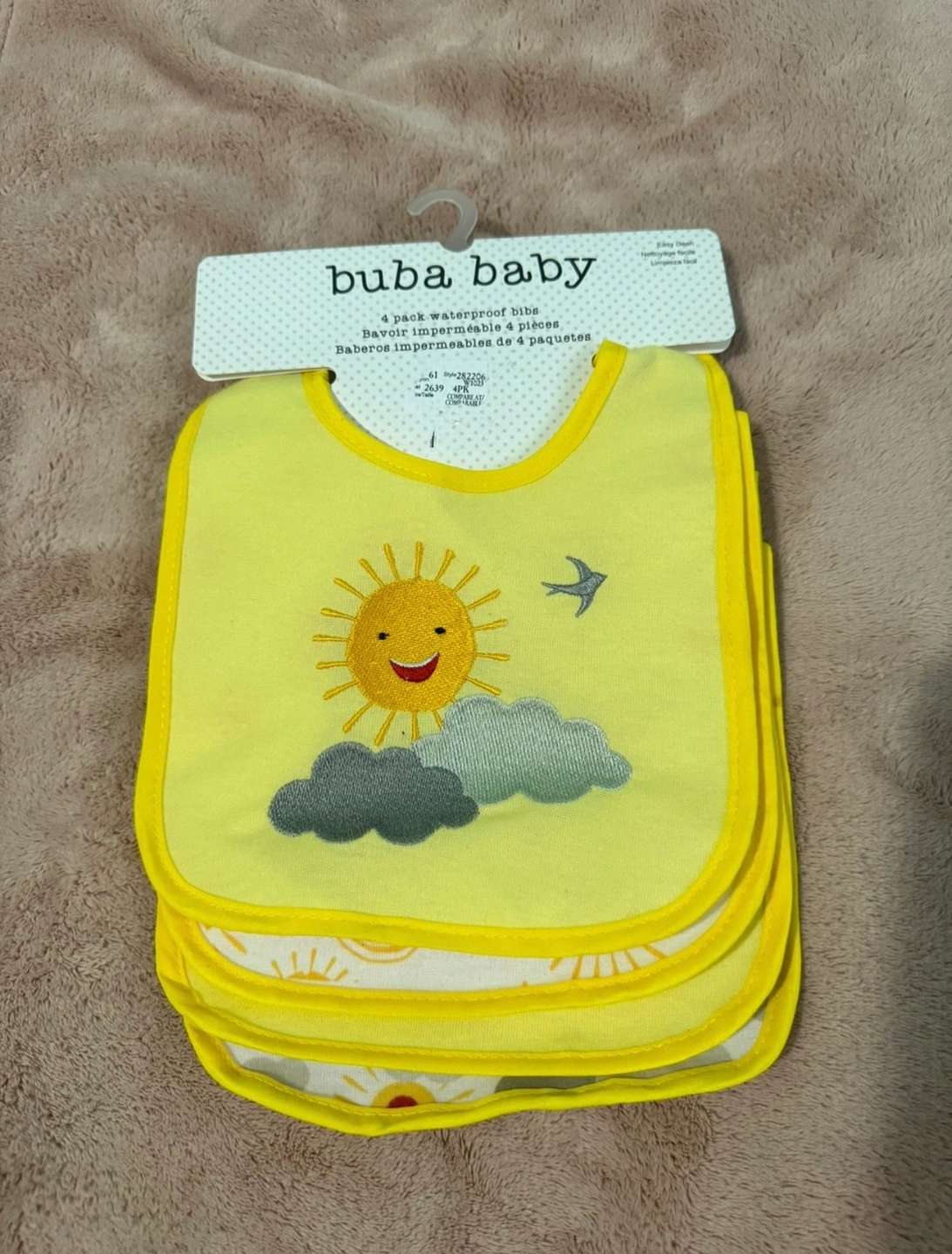 4 pack of waterproof bibs with a sun design