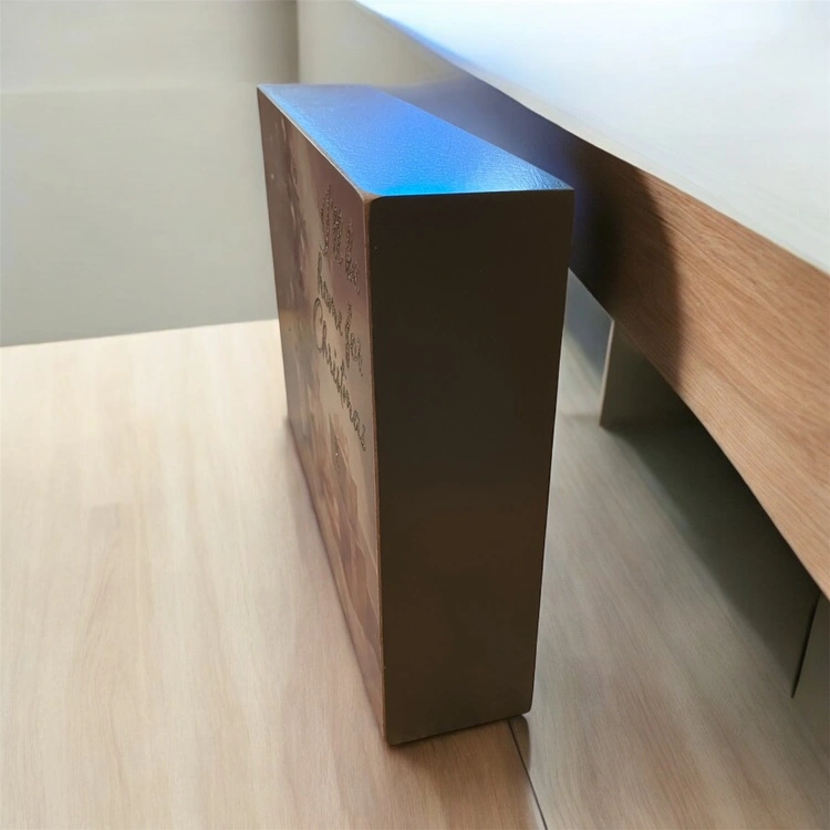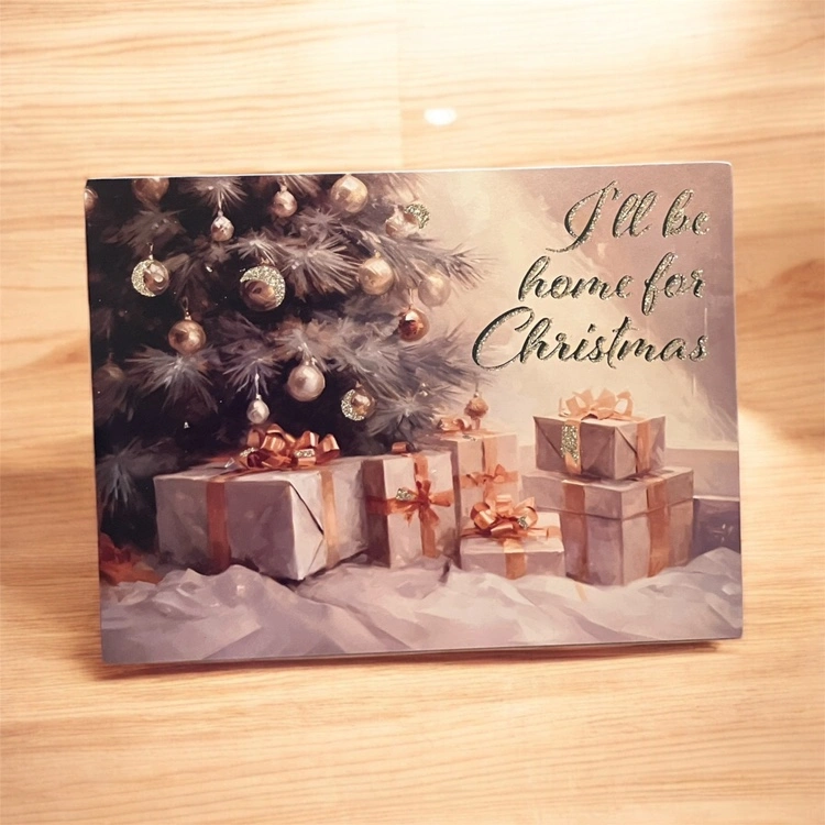 NEW wooden box sign featuring "I'll be home for Christmas" sentiment with gold glittery ornaments covering a Christmas tree and presents with ribbon surrounding the tree. There is a distressed look on the corners of the box. The beautiful gold and silver tones are stunning and complements well with existing decor or coordinating design pieces. Easy to hang or can free-stand alone on a shelf or mantel.