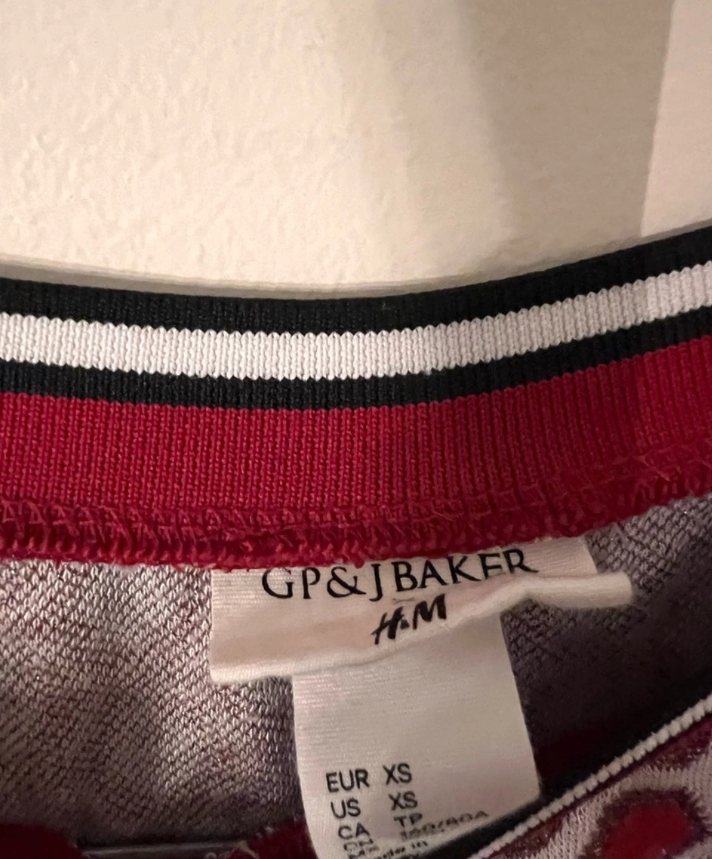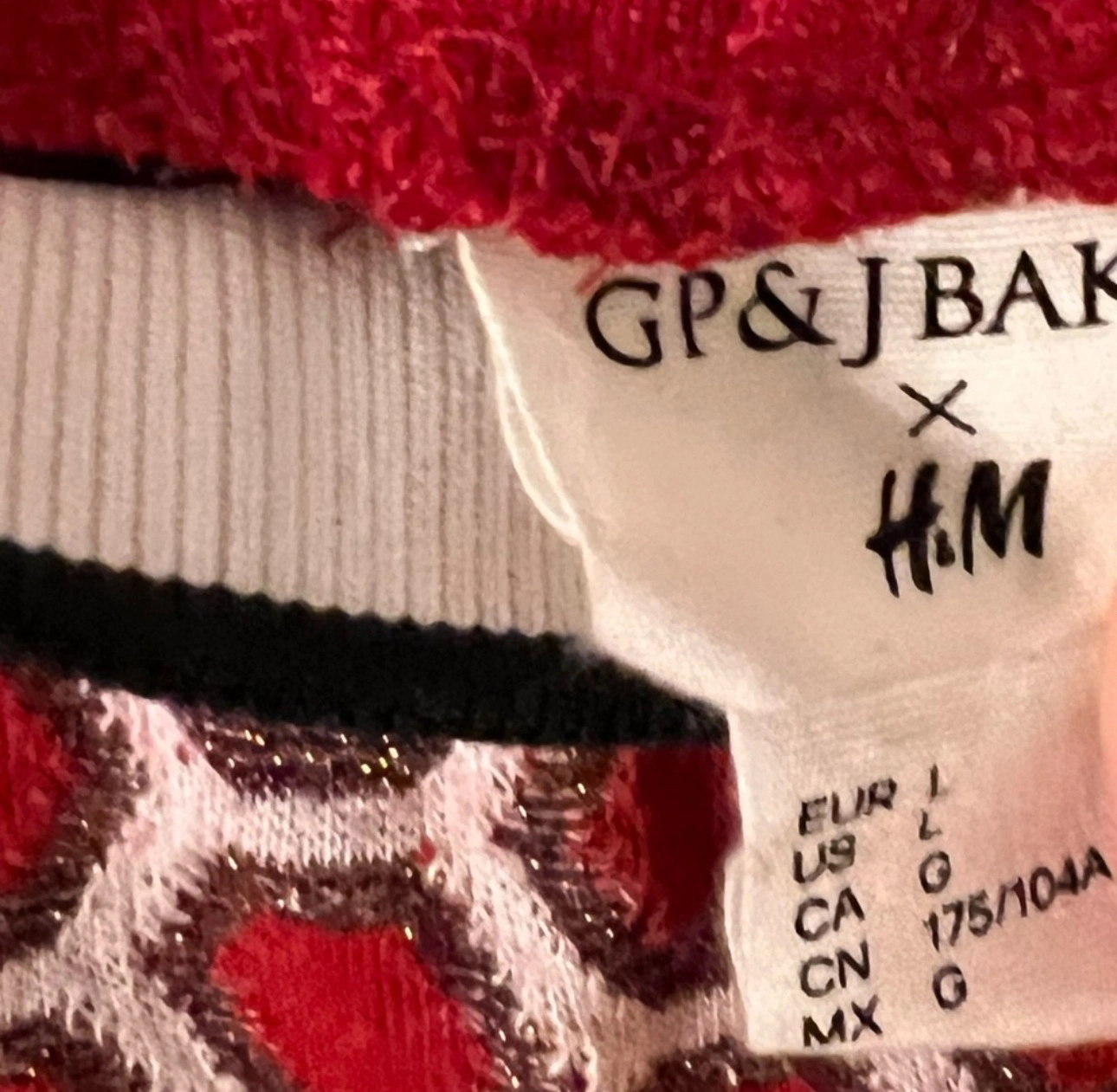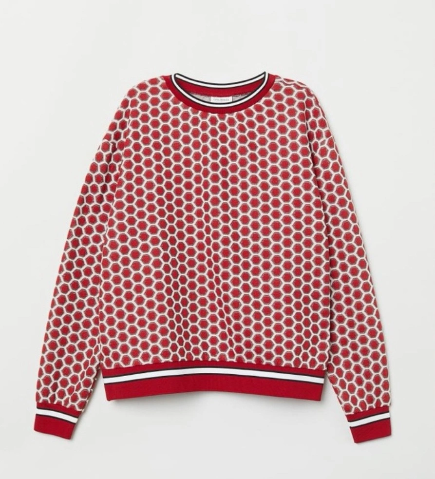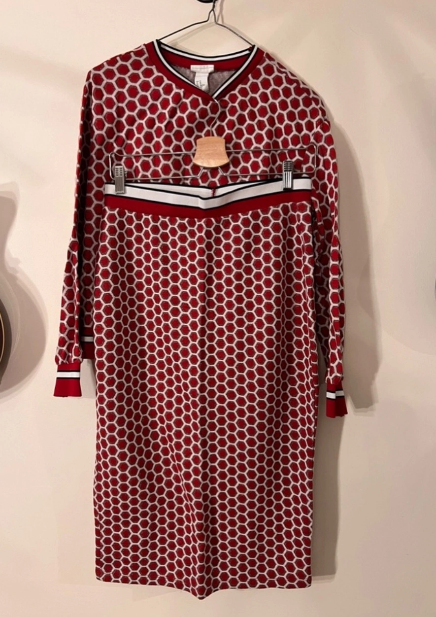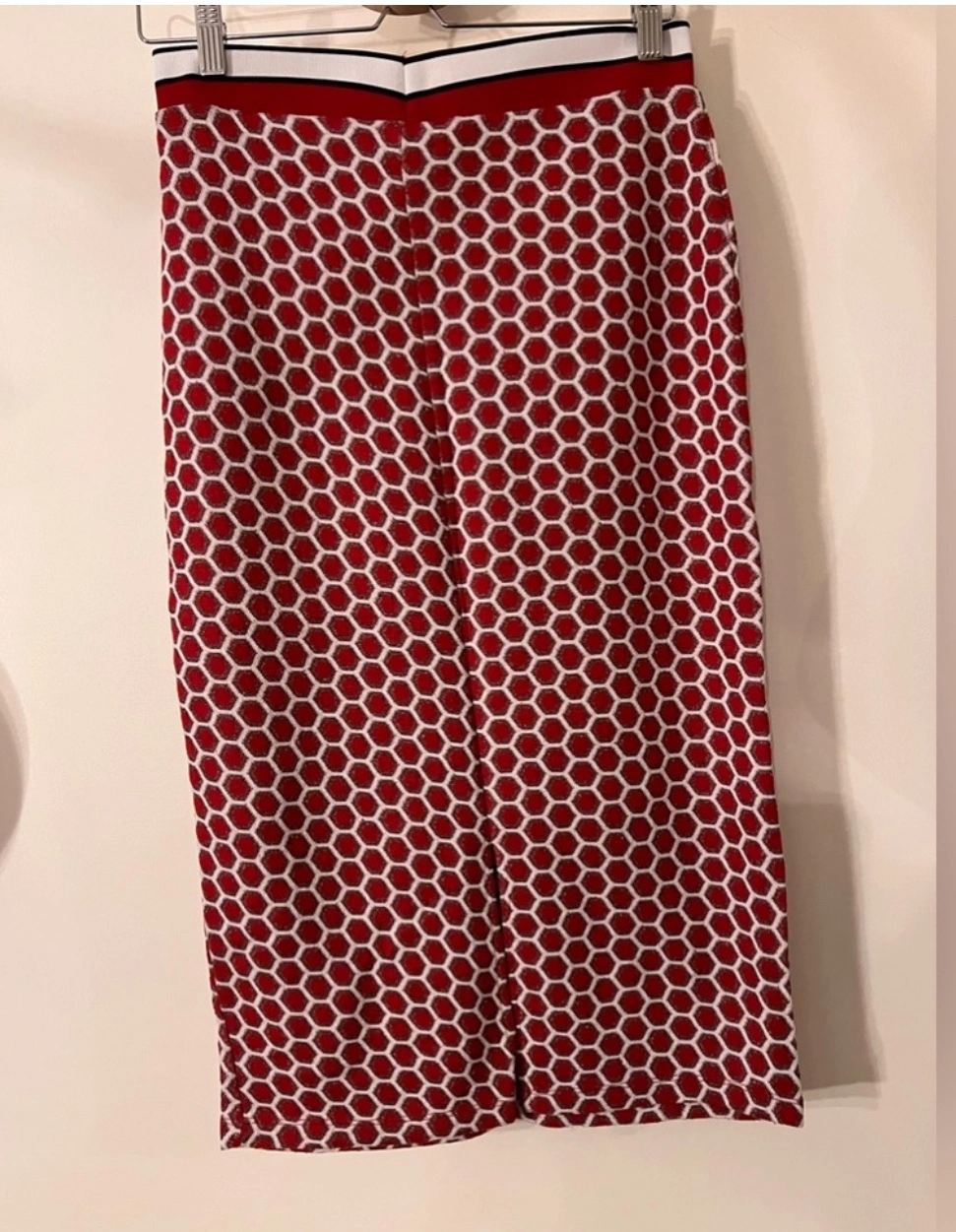 584Skirt set - Includes sweater (XS) relaxed fit and matching skirt (L) pencil cut. Both feature a geometric print with black, white, and red trim. Worn only once. Skirt stretch waistband - 40cm hips 49cm Sweater shoulder - 53cm Bust 50cm