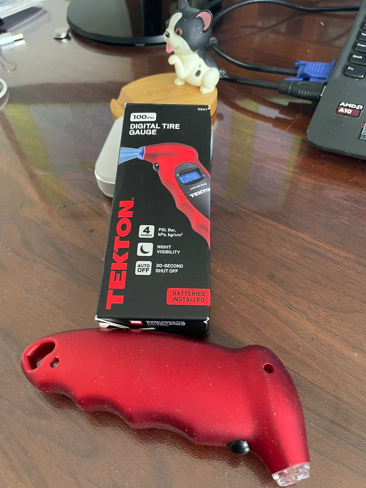Digital Tire Gauge with a backlight and 4 different pressure range settings. Includes batteries. (By the way its inside two kind of batteries fully change new)