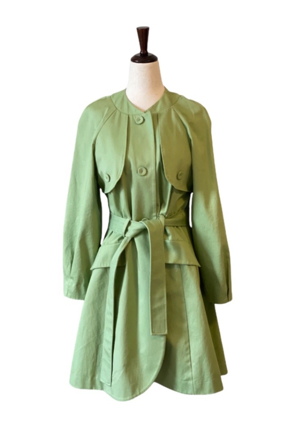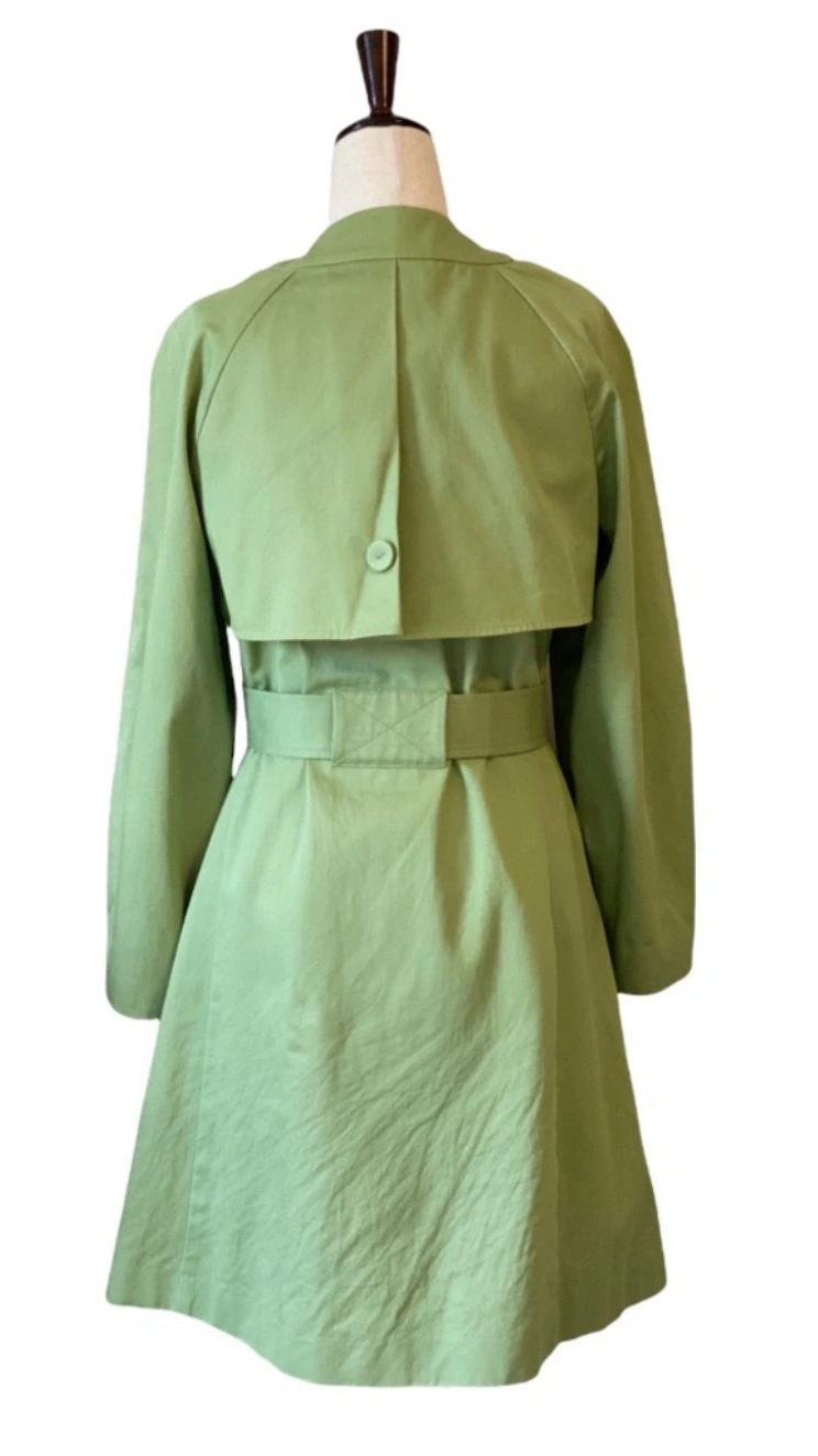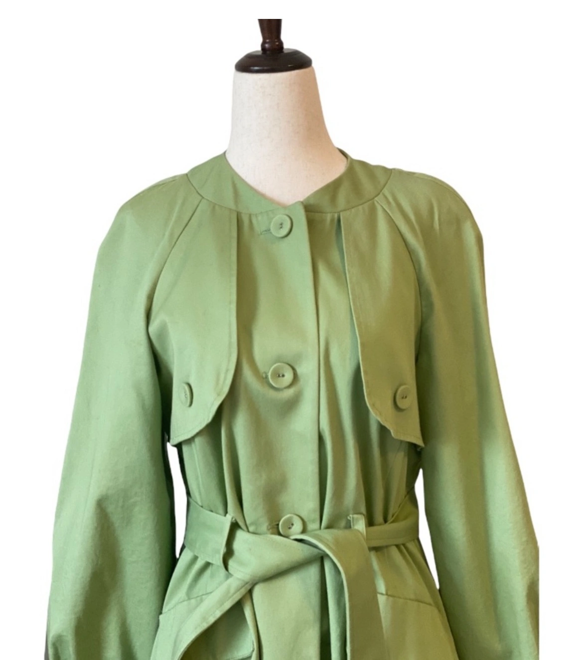 584A green trench coat with a belt and buttons. It has long cuffed sleeves, a collar, and a flap over the chest. The coat is lined. Size US M 100%cotton