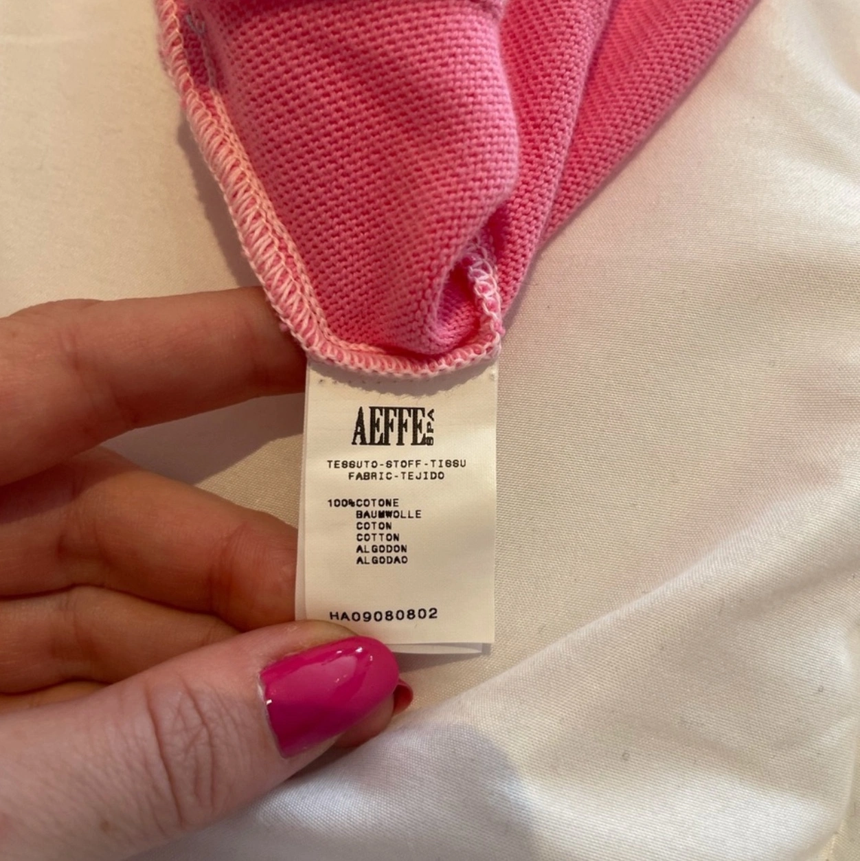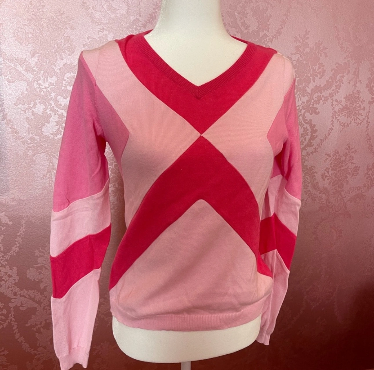 584Moschino cheap and chic brand. Pink sweater featuring a geometric design in shades of pink. Made in Italy. Size 12. 100% cotton.