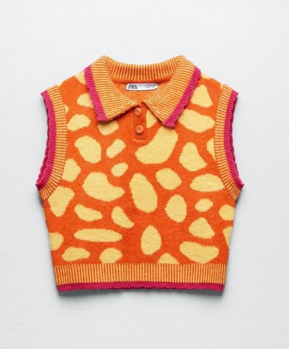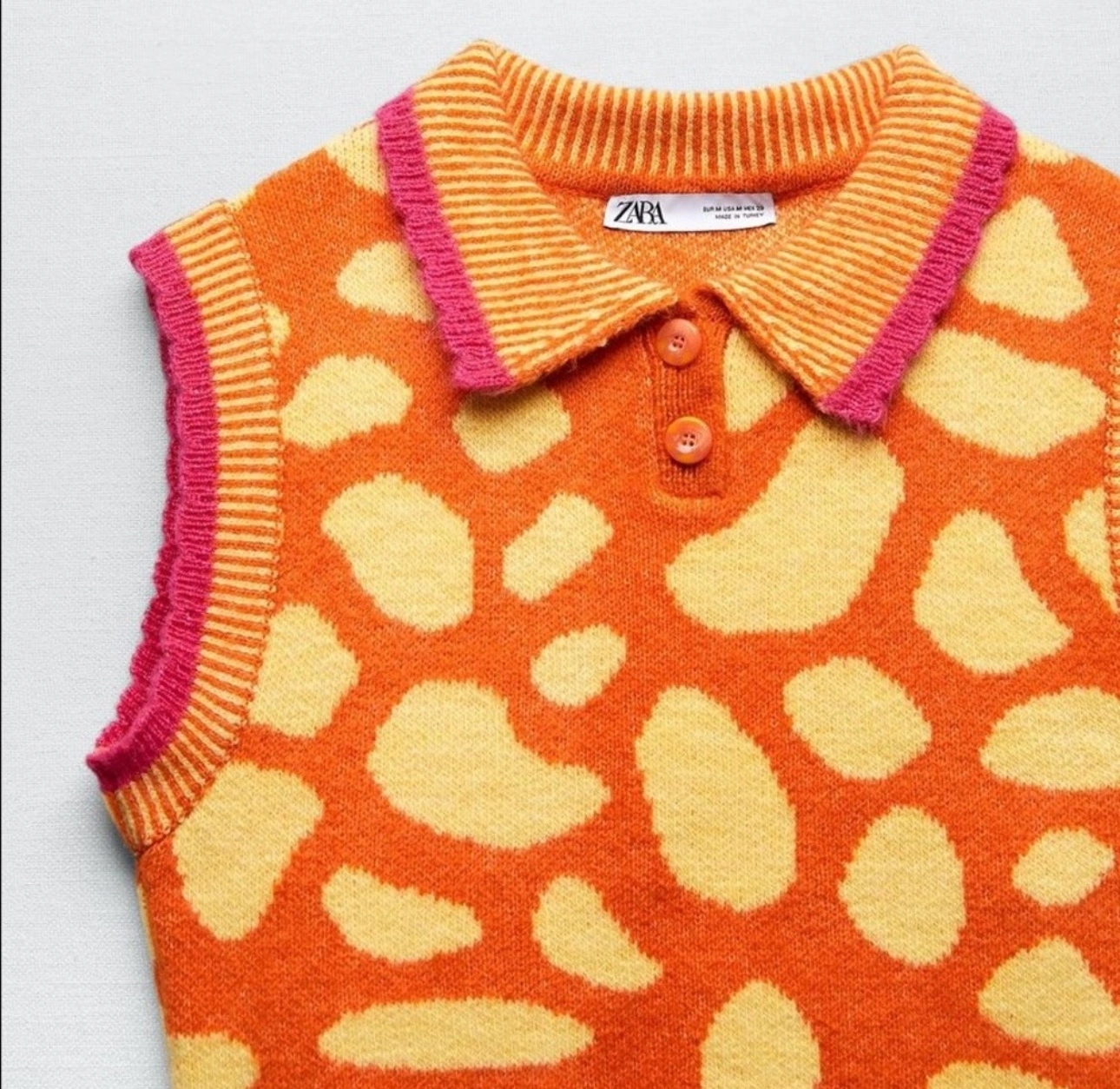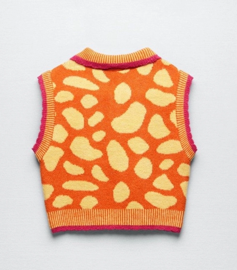 584Only worn once. A sleeveless knit vest with a collared neckline and button closure.
