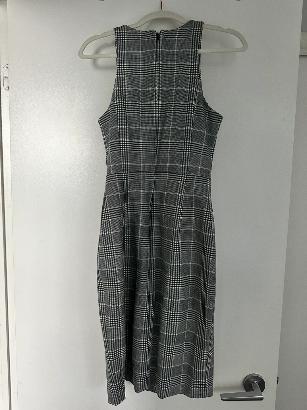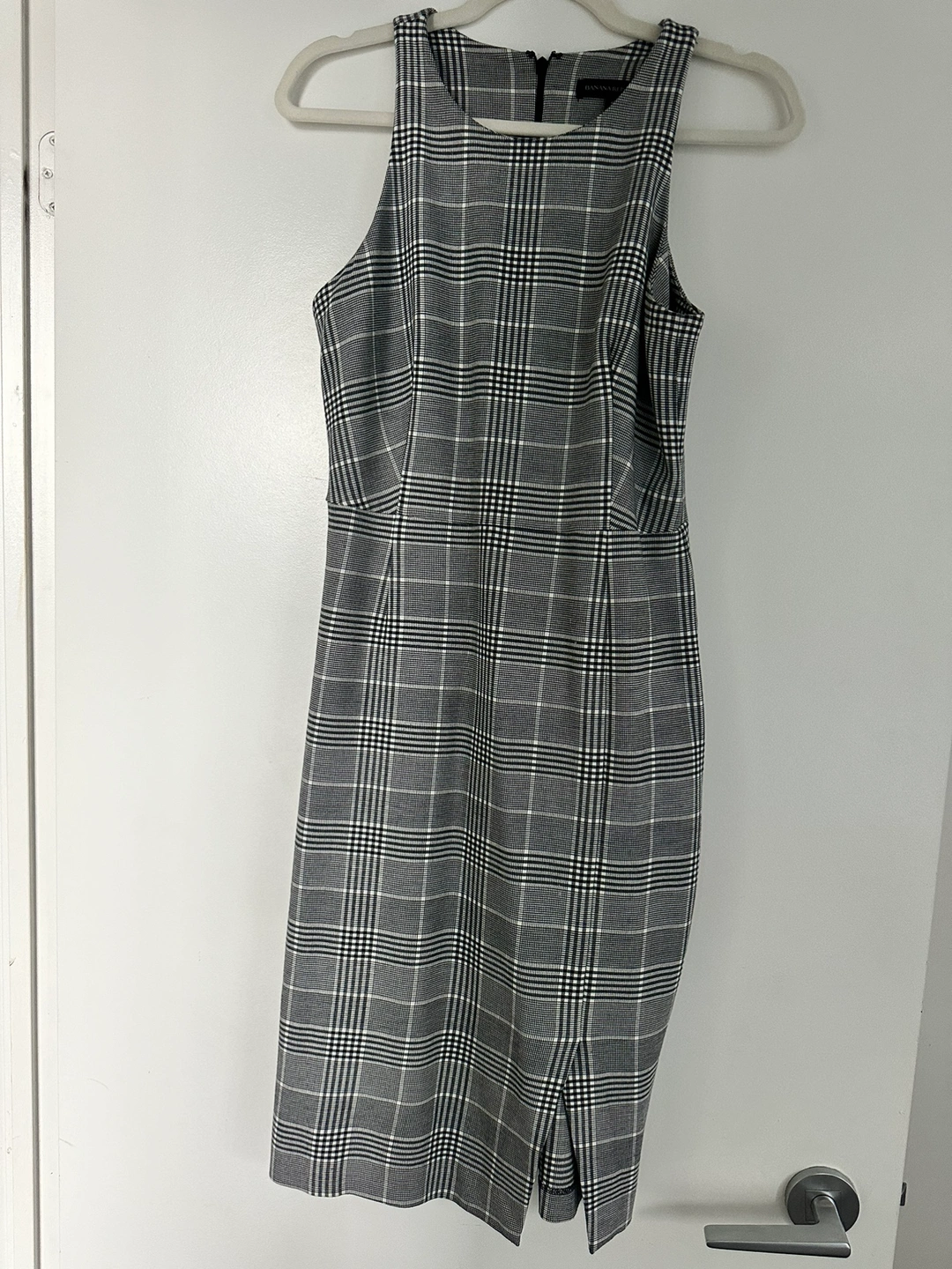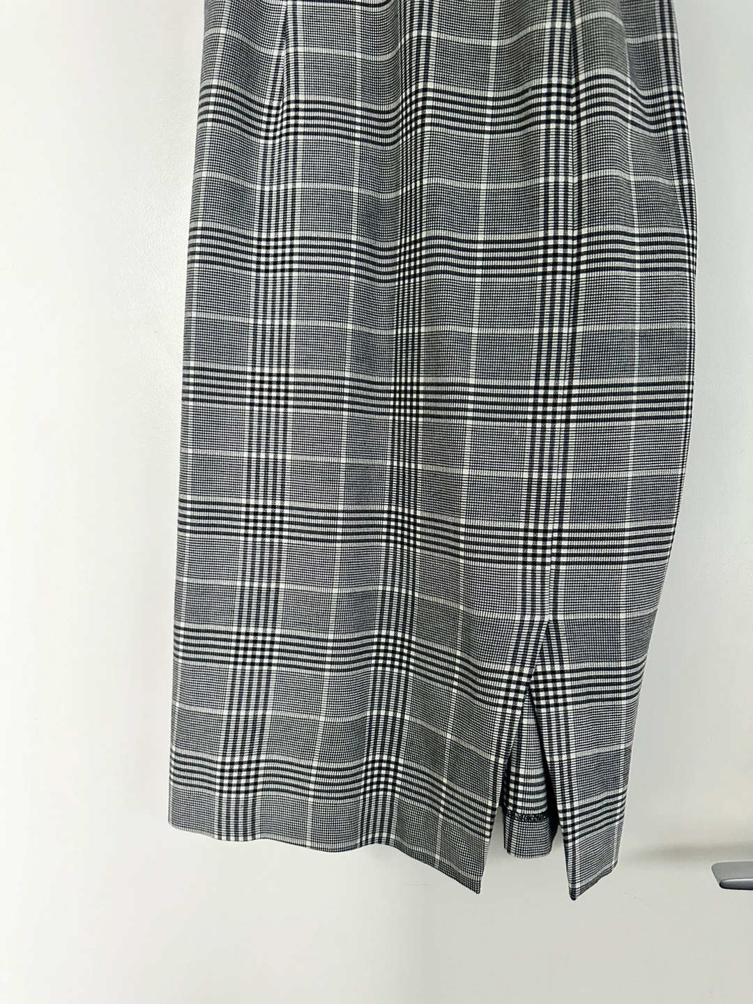 Black and white plaid sleeveless dress with a side slit. The dress has a high neckline with a zipper in the back. It is a classic and stylish piece. A great addition to any wardrobe.
