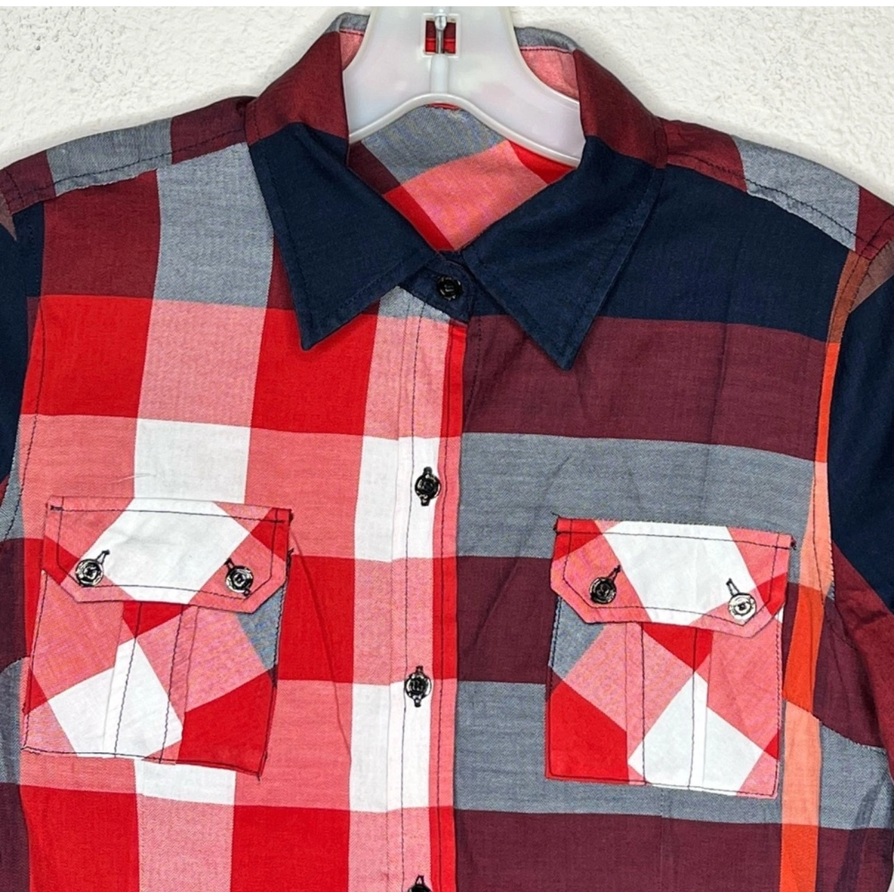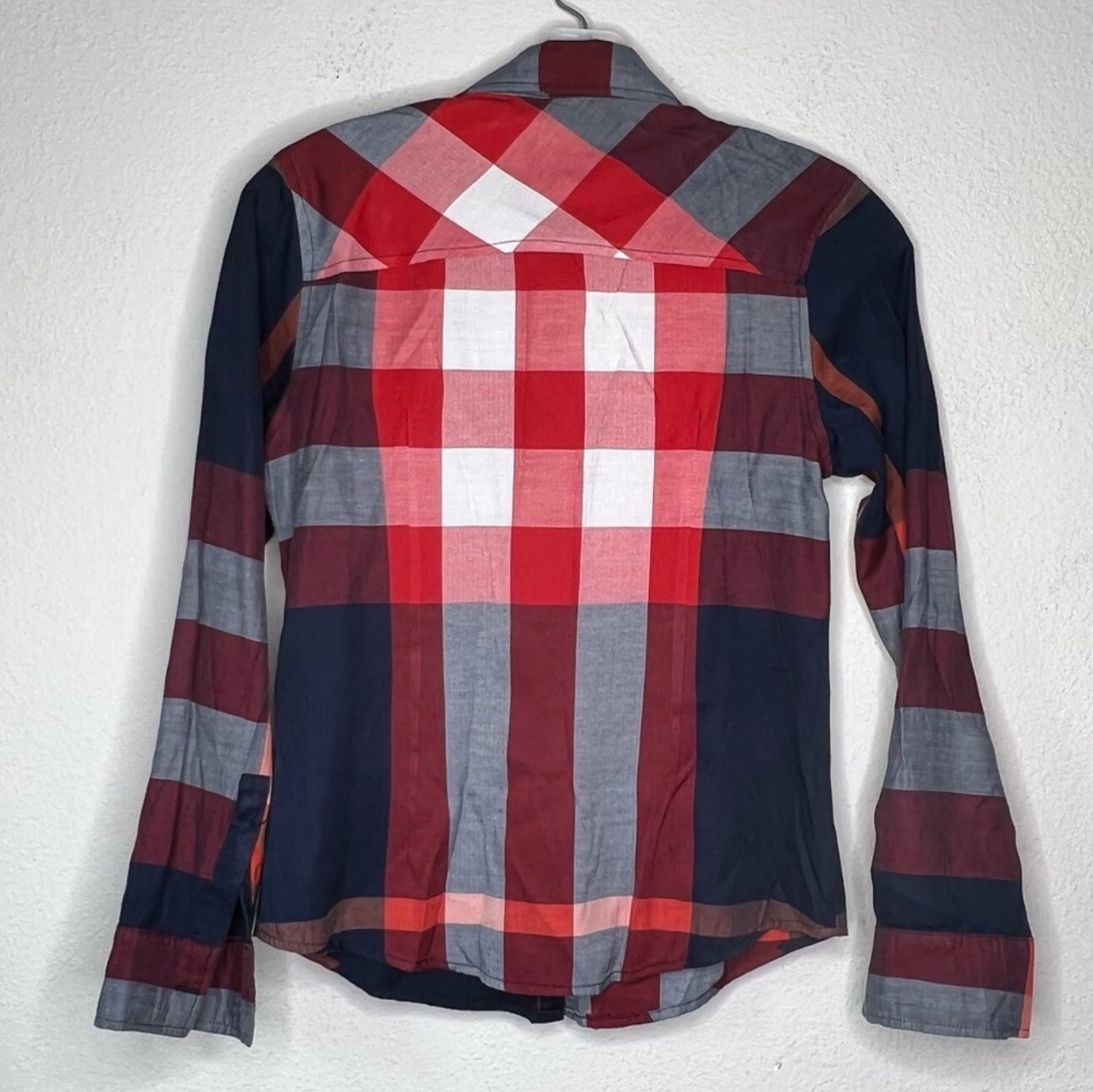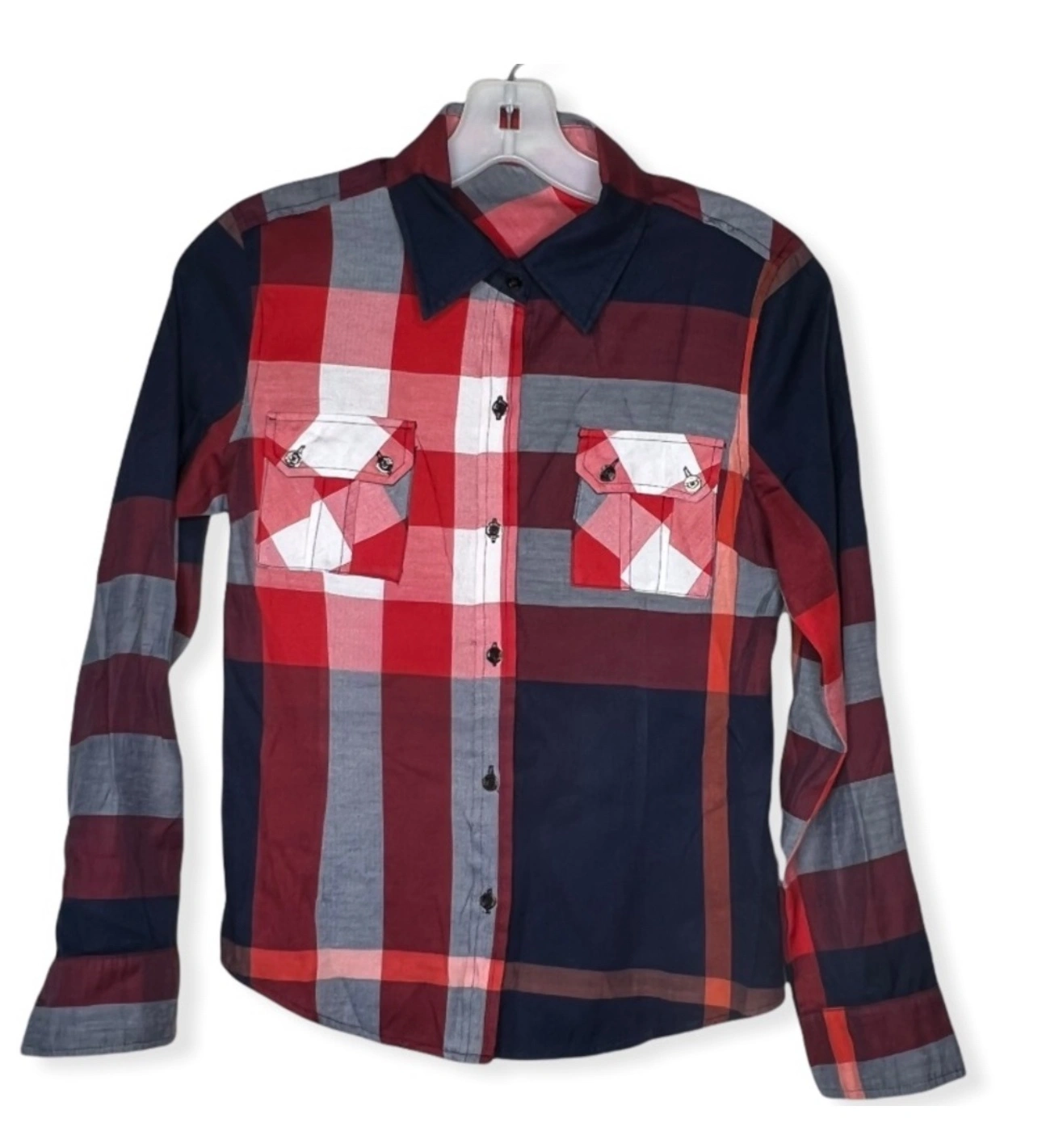 584Runs small more like an S size. Long-sleeved button-up shirt with two chest pockets and a plaid pattern. Made in Hong Kong. 100% cotton. Machine washable.
