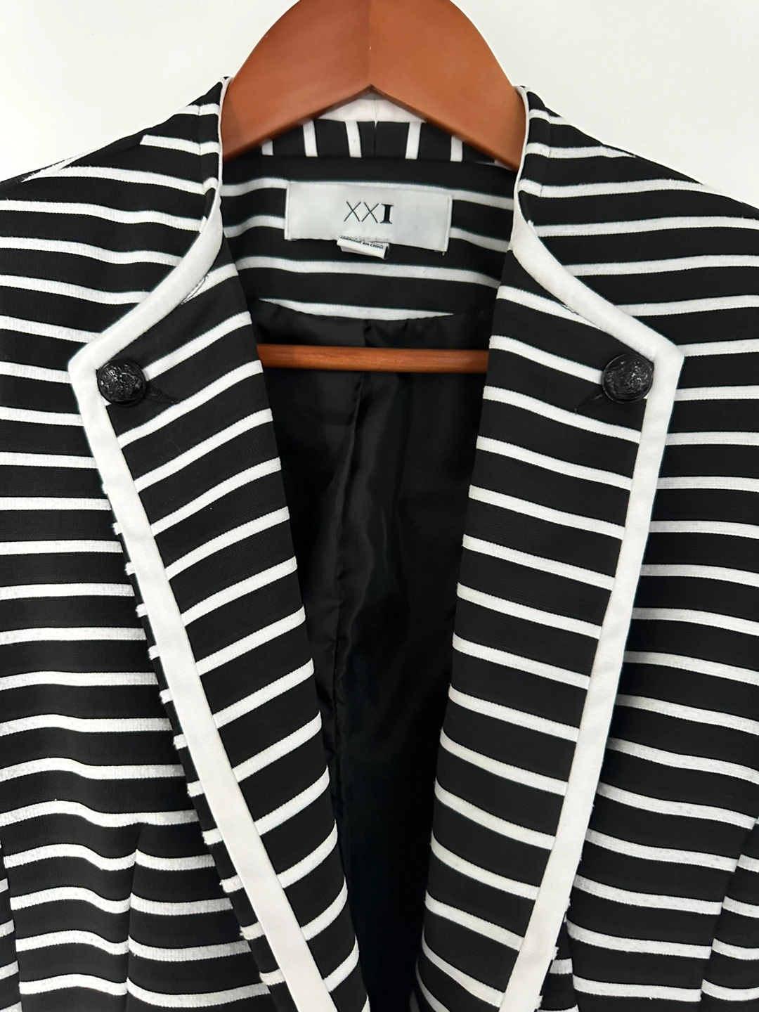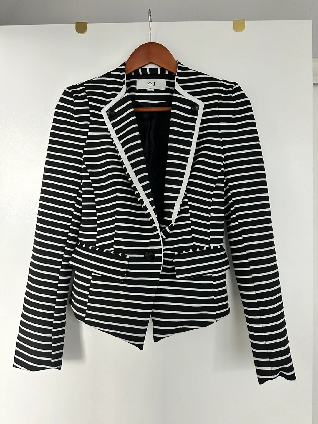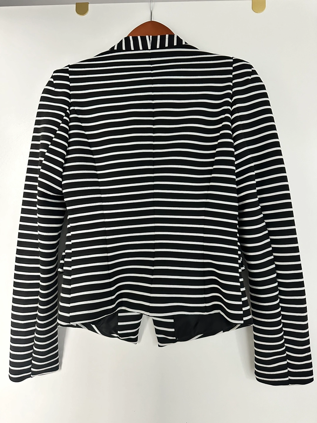 584Black and white striped blazer with white trim. One button closure. Two fake front pockets. Long sleeves. Cropped length.