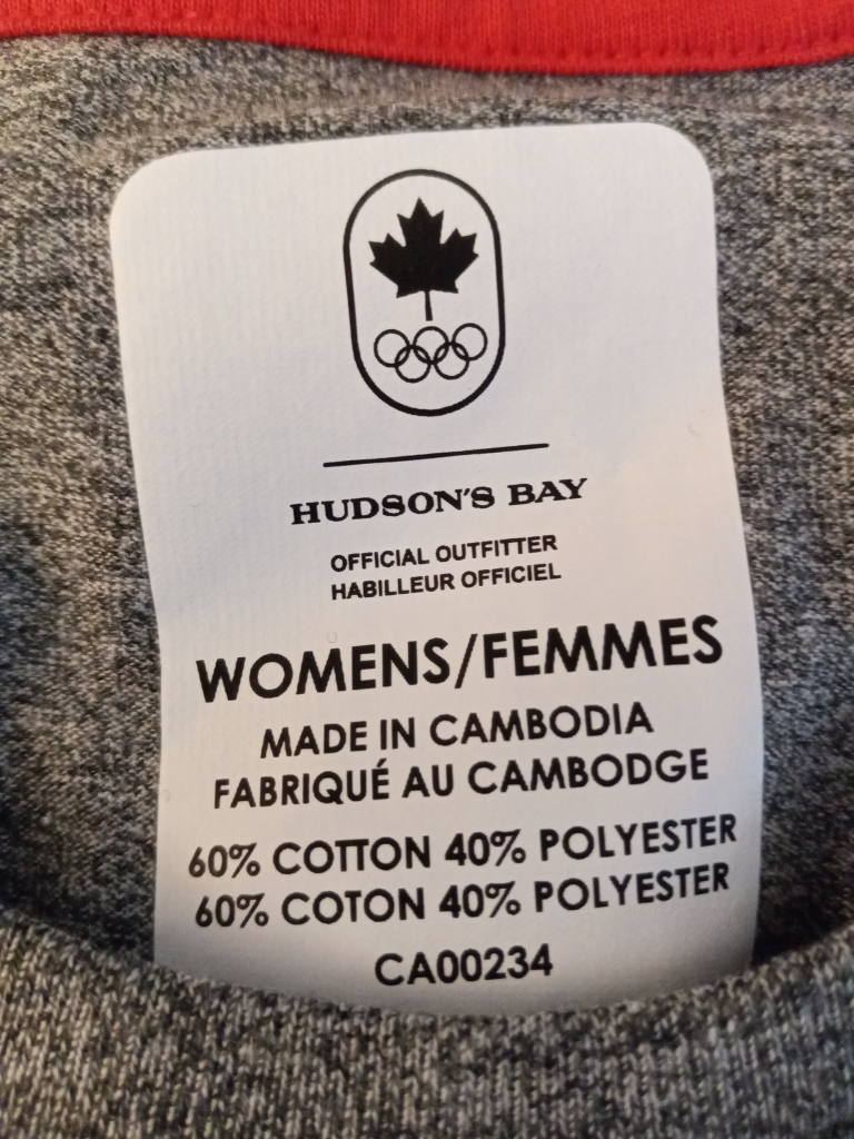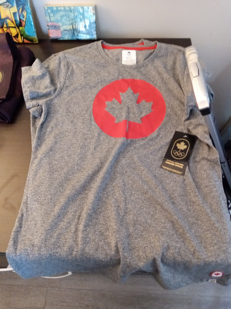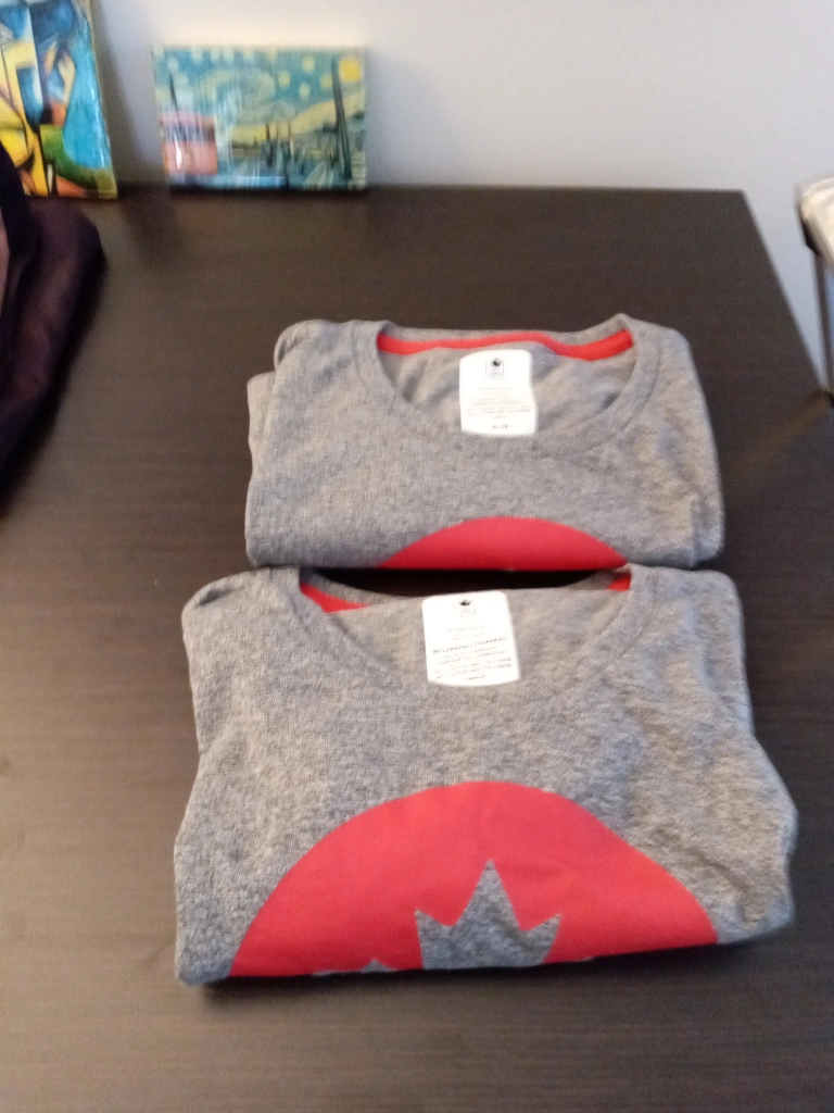 Great for pyjama tops.Two grey women's medium t-shirts featuring a large red Canadian maple leaf in a circle on the front. The shirts are a 60% cotton and 40% polyester blend and have a tag that says "Hudson's Bay Official Outfitter". pick up only near Eglinton West subway station