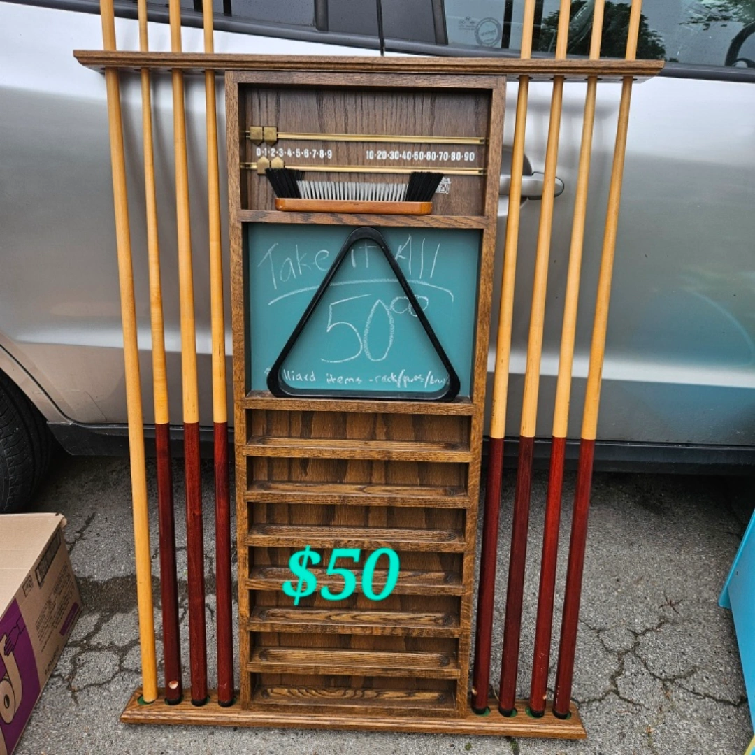 25A wooden pool cue rack with 8 cues. Triangle rack, pool table brush.