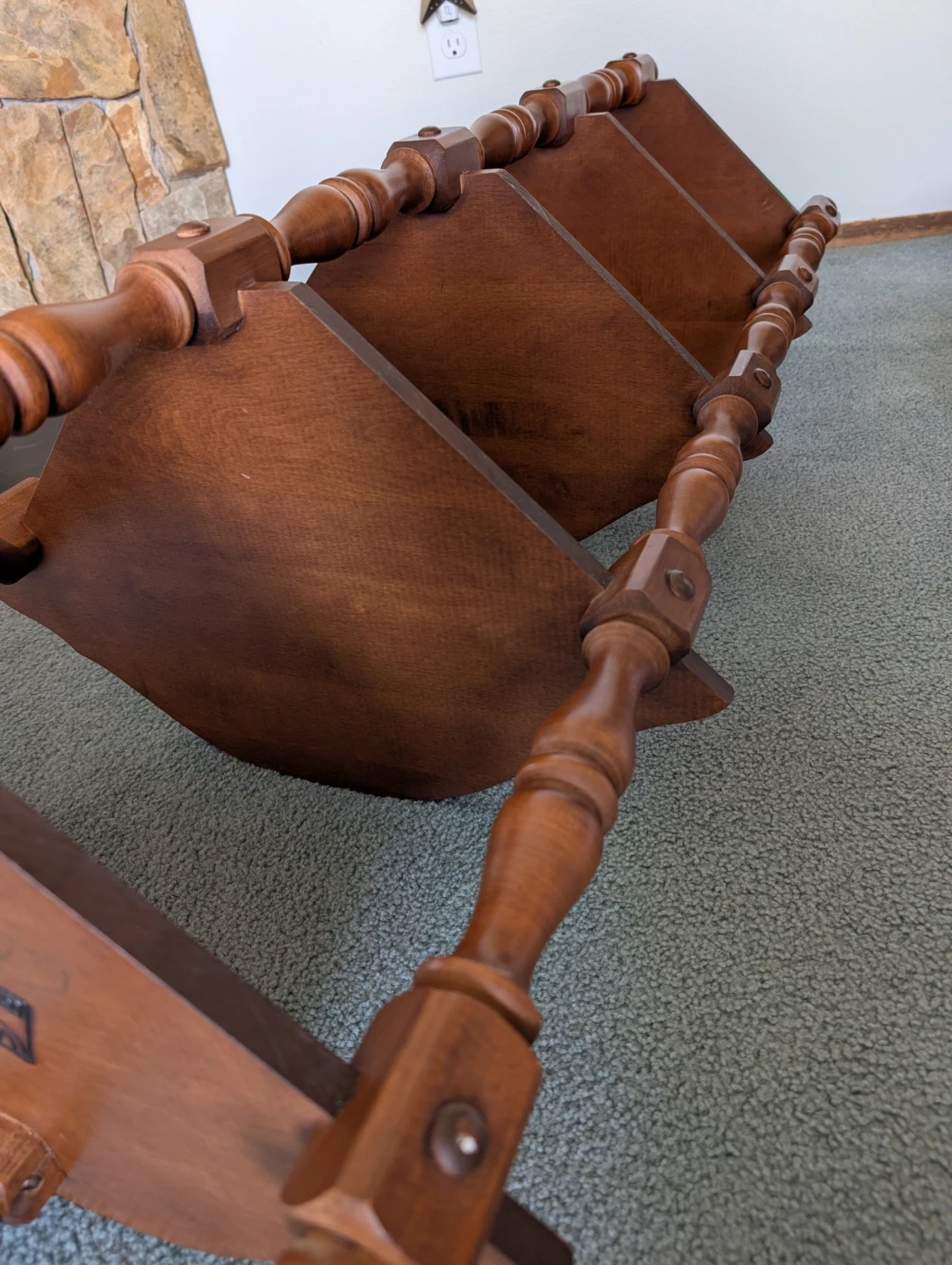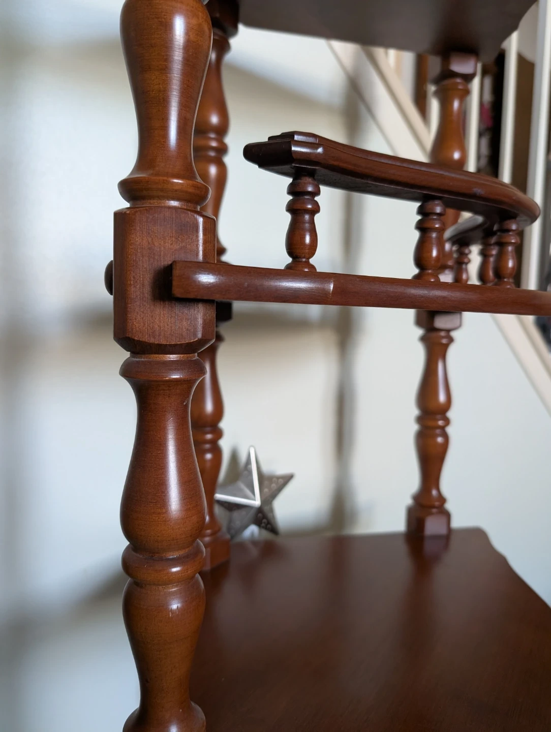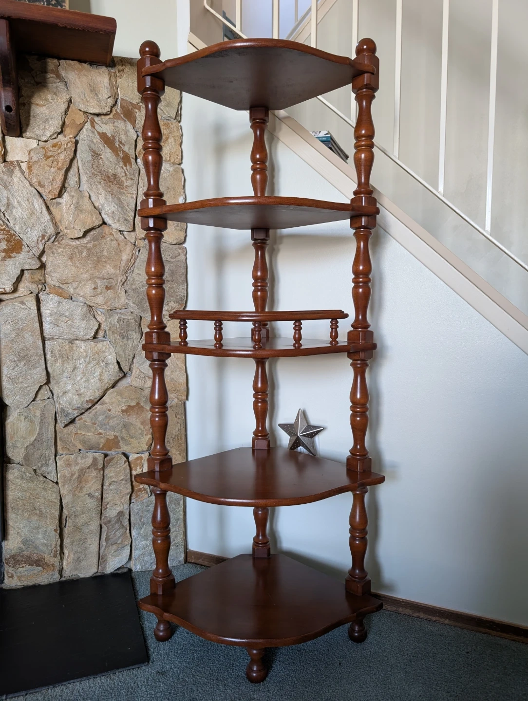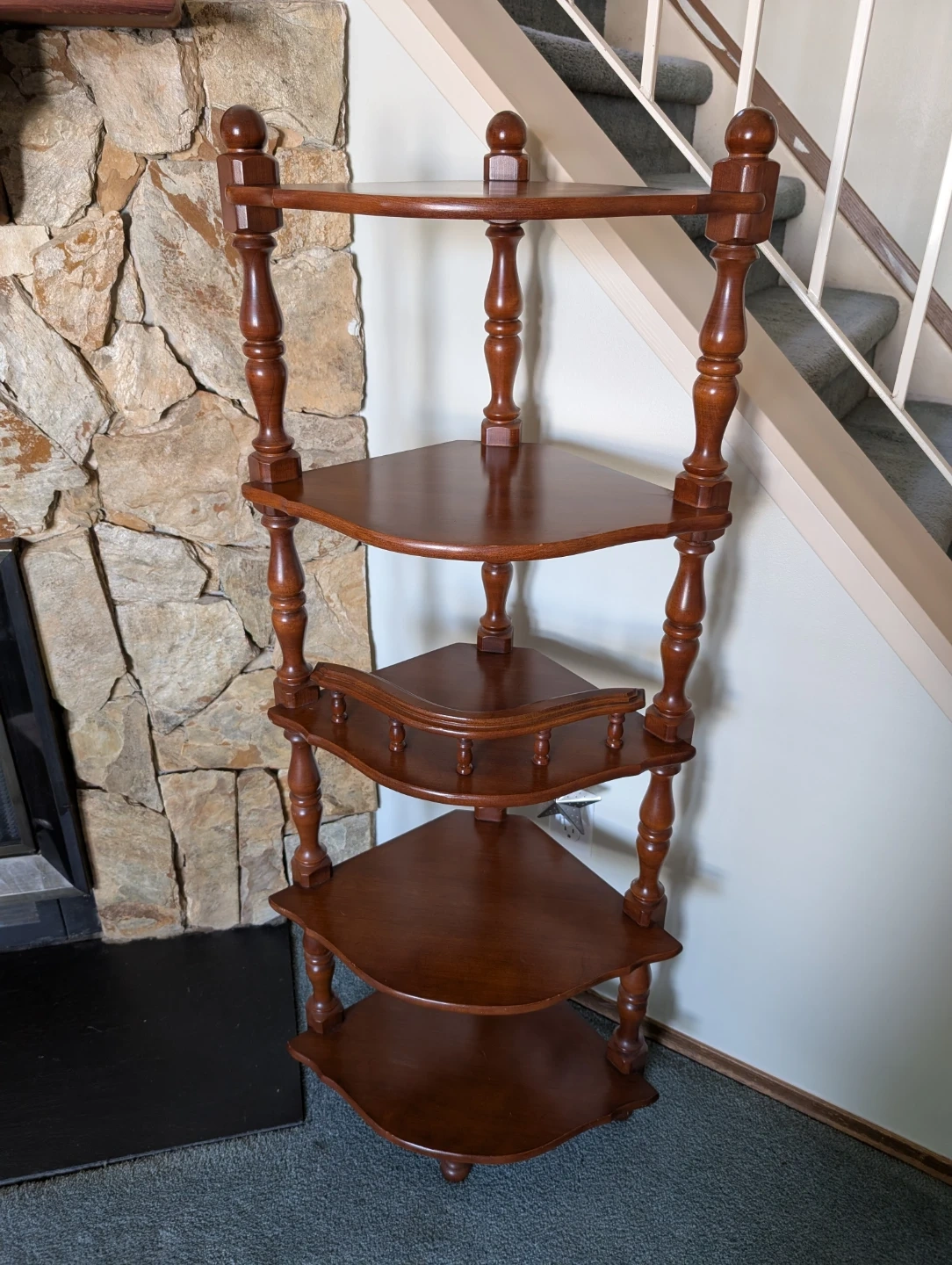This is a classic vintage wooden 5 tier corner shelf unit. It's made of solid wood with a rich brown finish. It has five tiered shelves, perfect for displaying plants or decor. Decorative. Ornate spindles. Very few scratches. Really good condition.