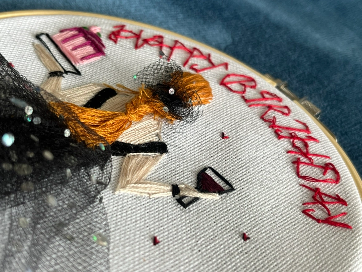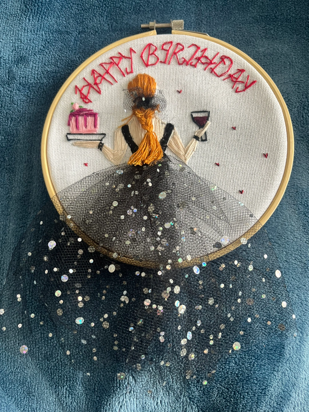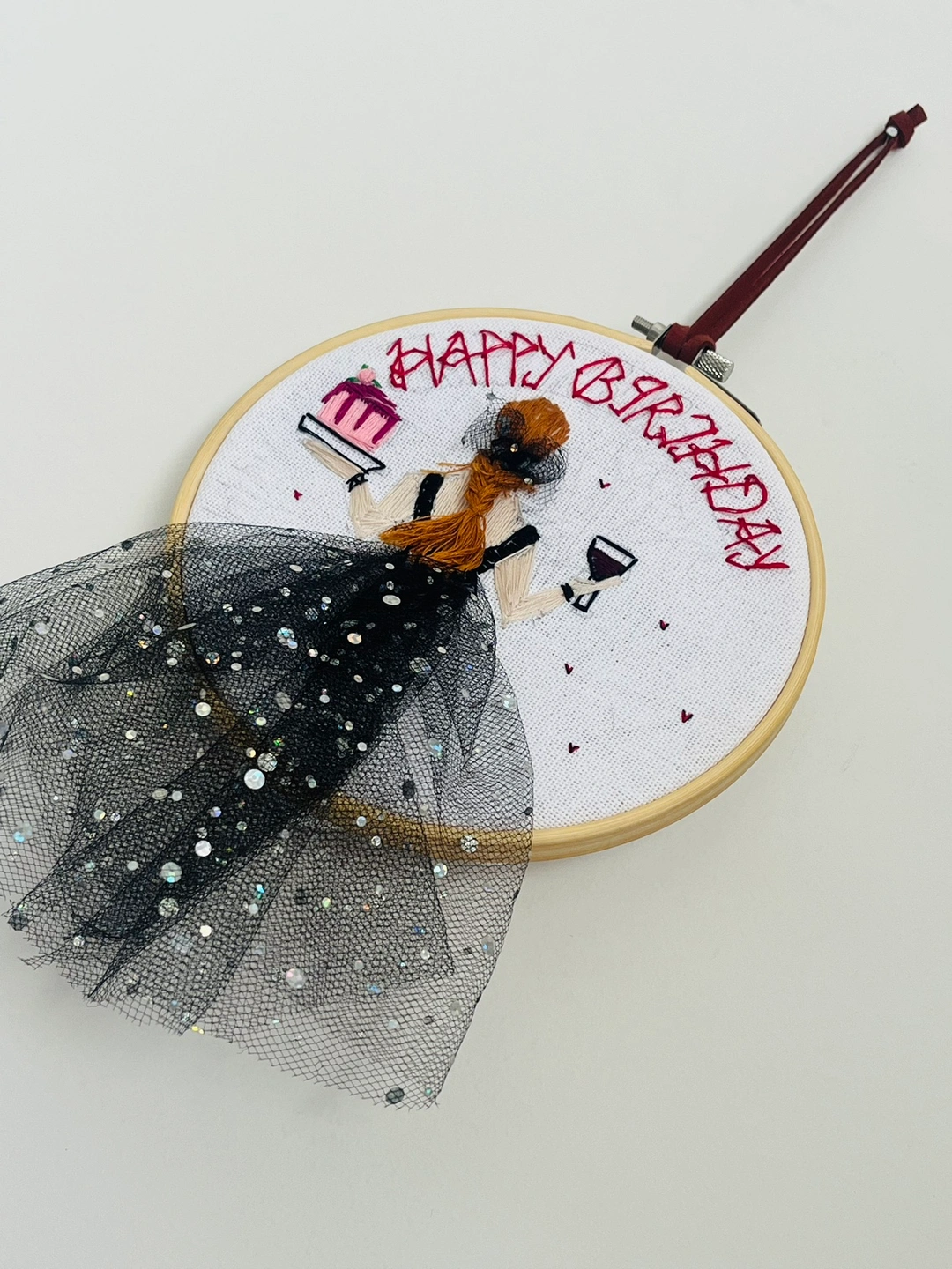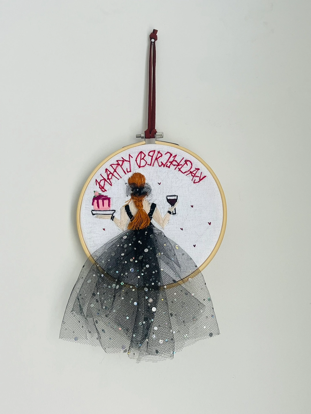 25This hoop is embroidered with a woman holding a glass of wine and a cake. The embroidery is on a white canvas and is framed in a wooden hoop. There is black tulle around the edge of the hoop.