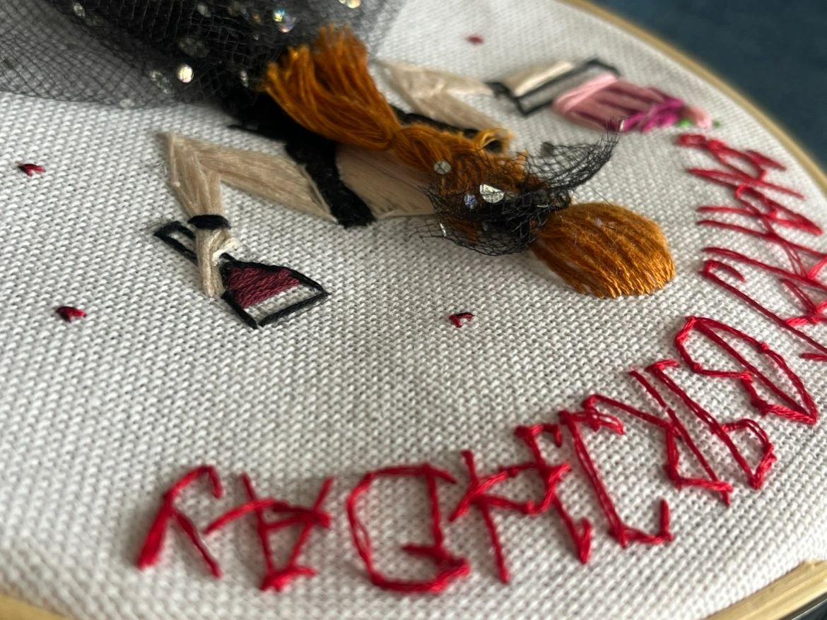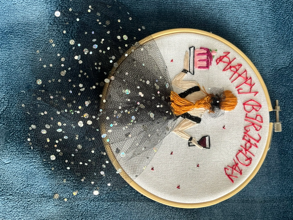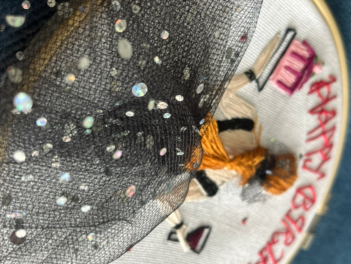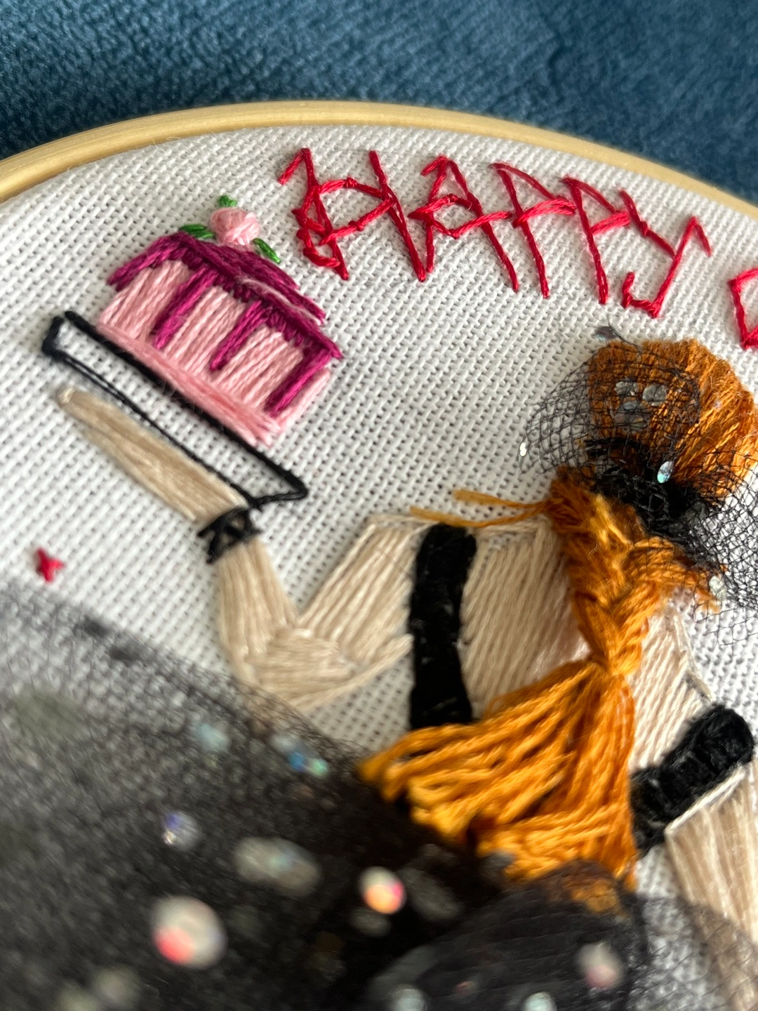 25This hoop is embroidered with a woman holding a glass of wine and a cake. The embroidery is on a white canvas and is framed in a wooden hoop. There is black tulle around the edge of the hoop.