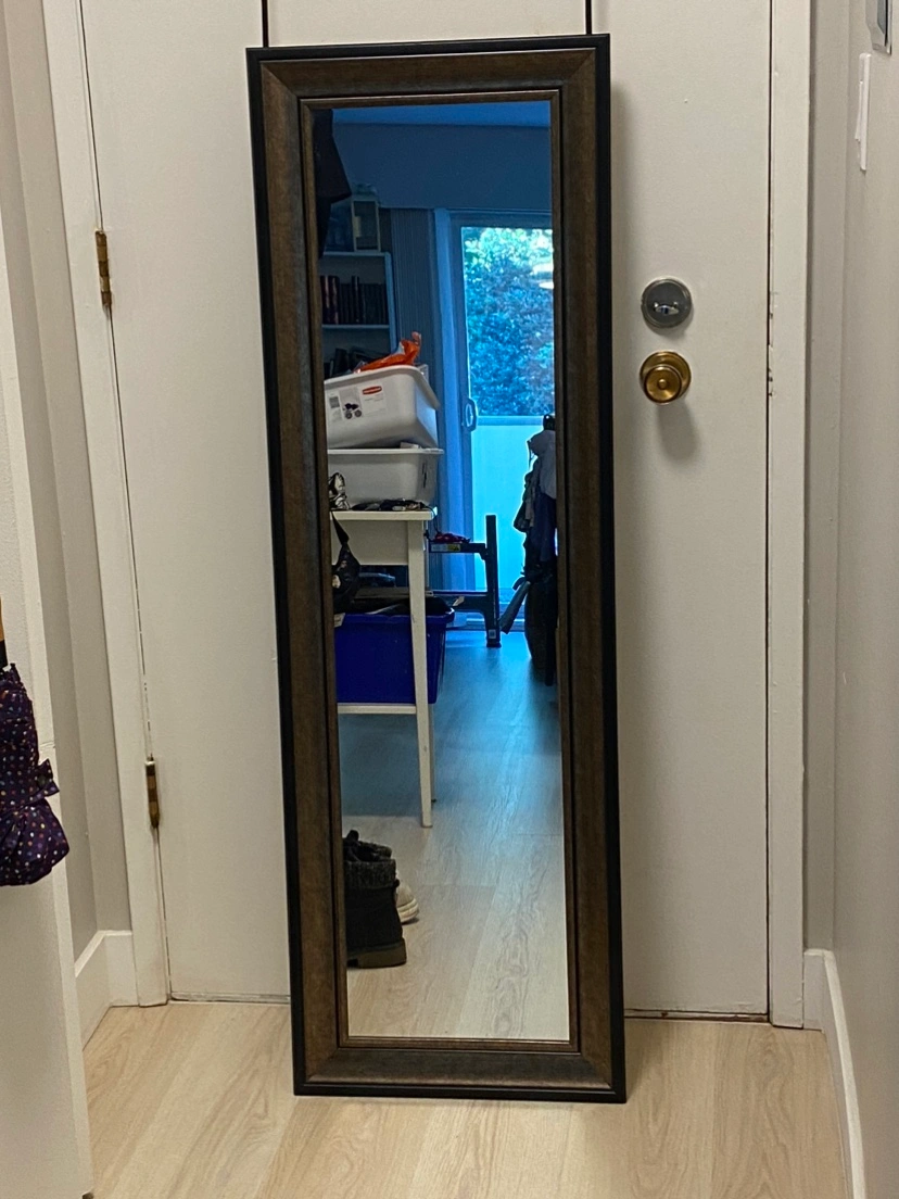 A full-length mirror with a brown wooden frame. It hangs off a door and has a standard rectangular shape.