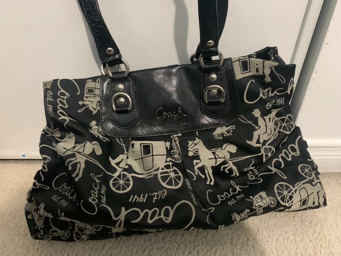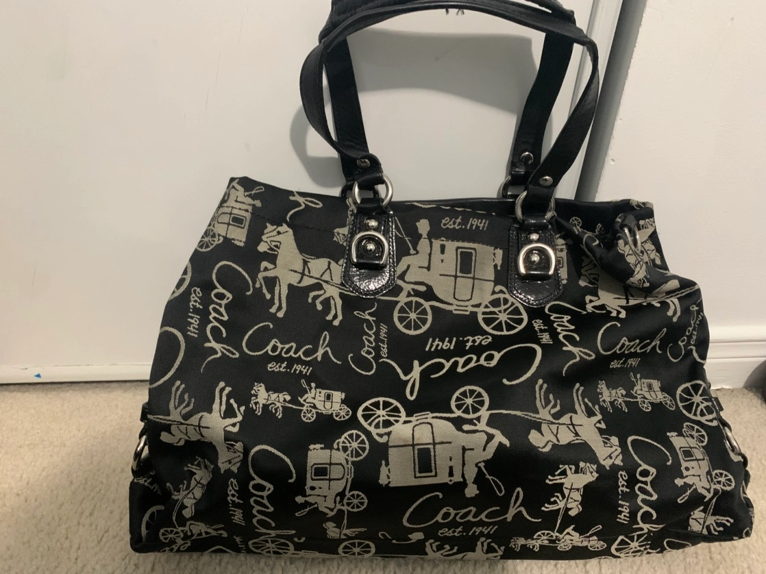 Black Coach handbag with a horse and carriage print. The bag has a black leather trim and handles. It has a zipper closure and an inside pocket. It is in like new condition.