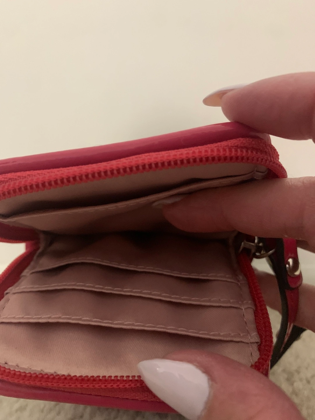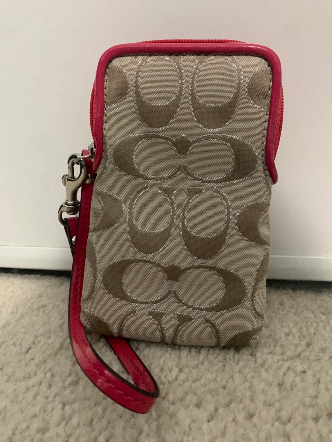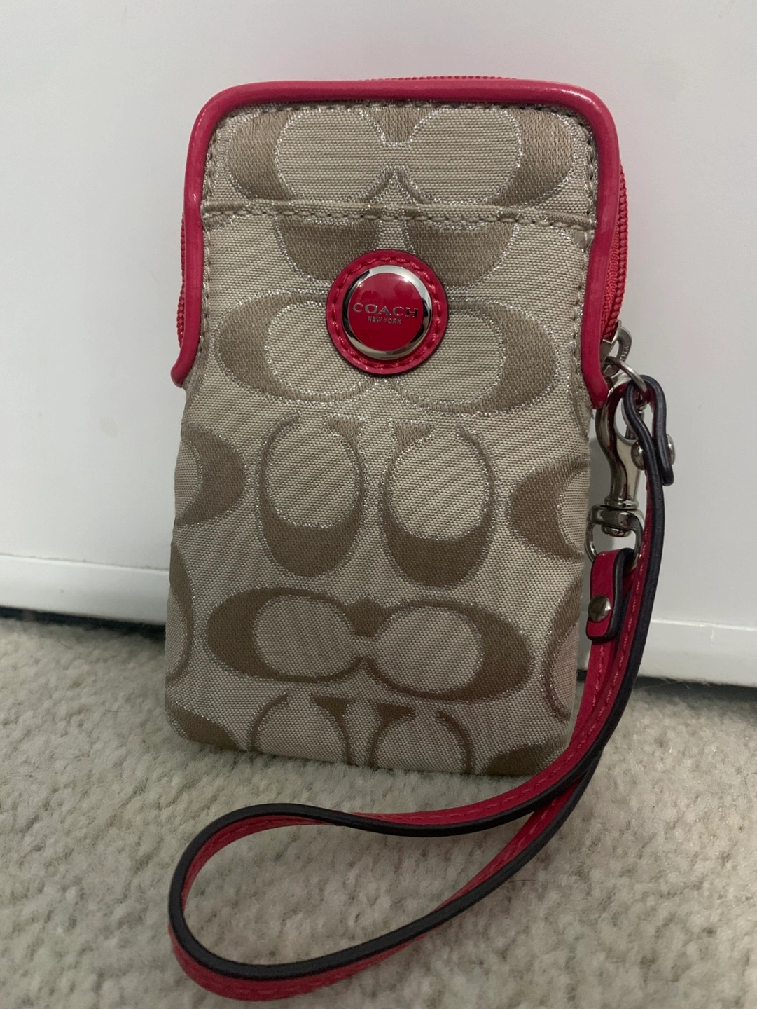 Small coral and beige Coach phone case with a wrist strap. Has a zipper closure and multiple card slots.