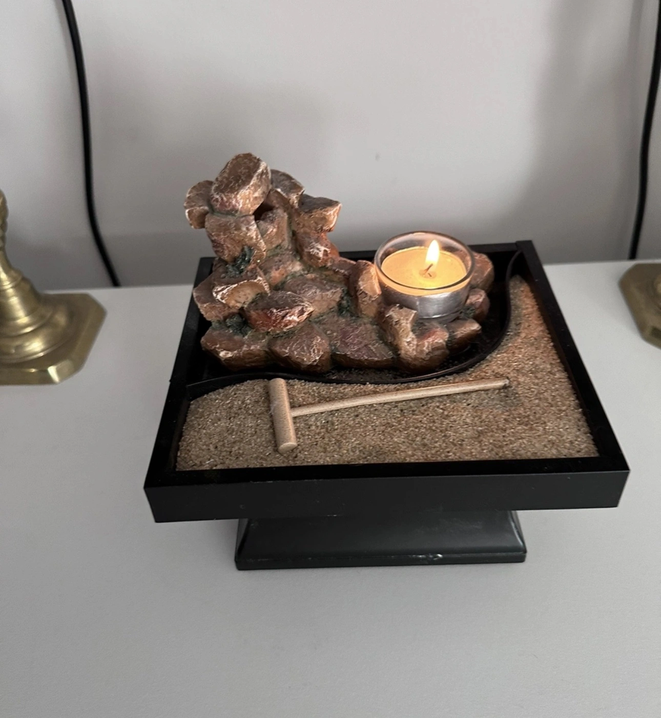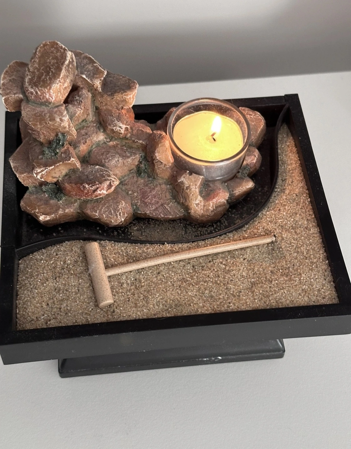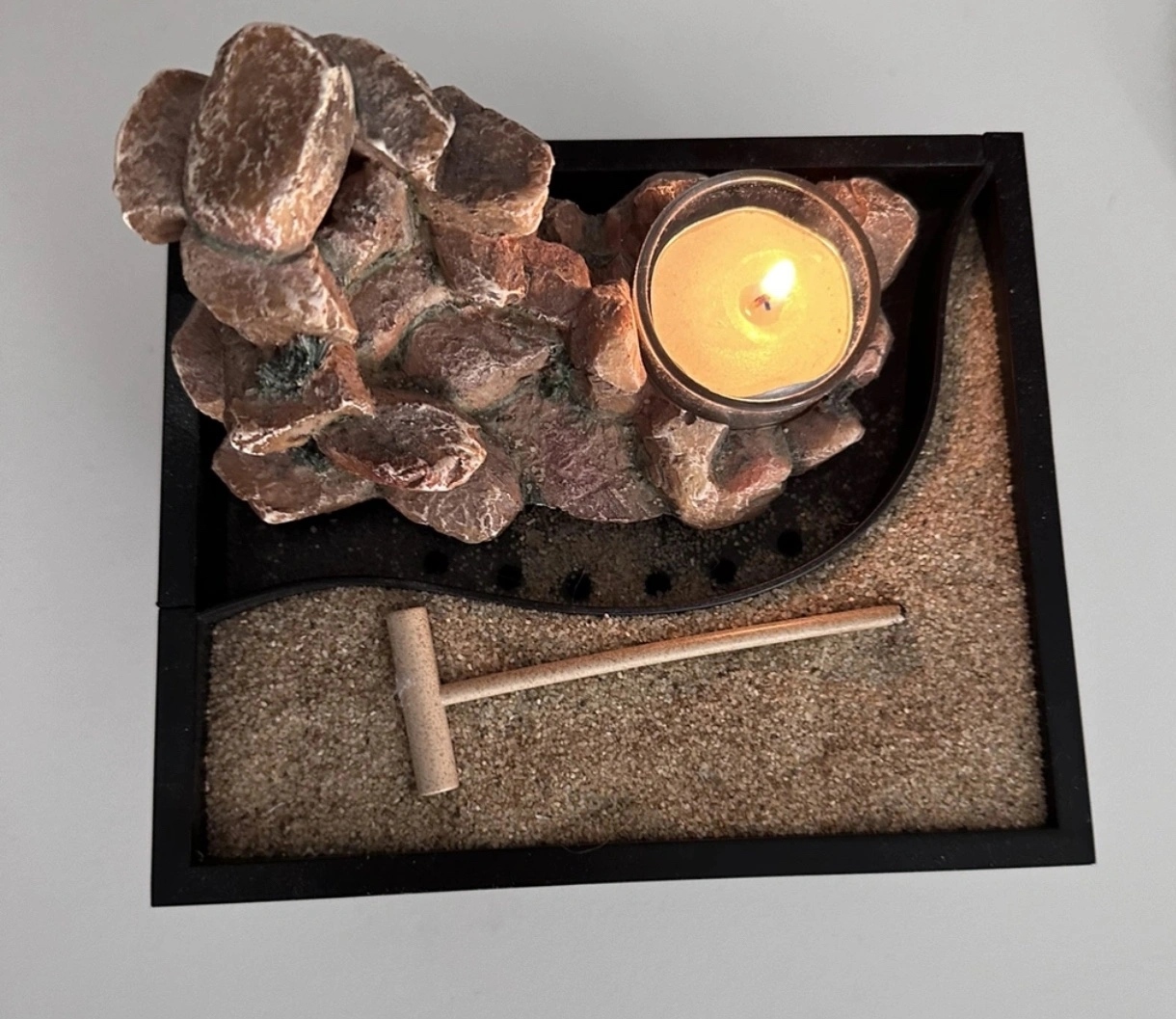 This zen garden features a small sand tray with a rake, a small rock formation, and a small candle holder.