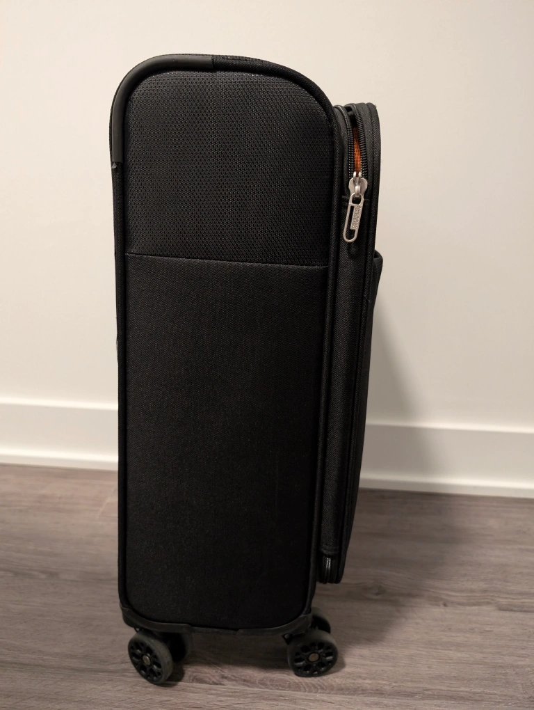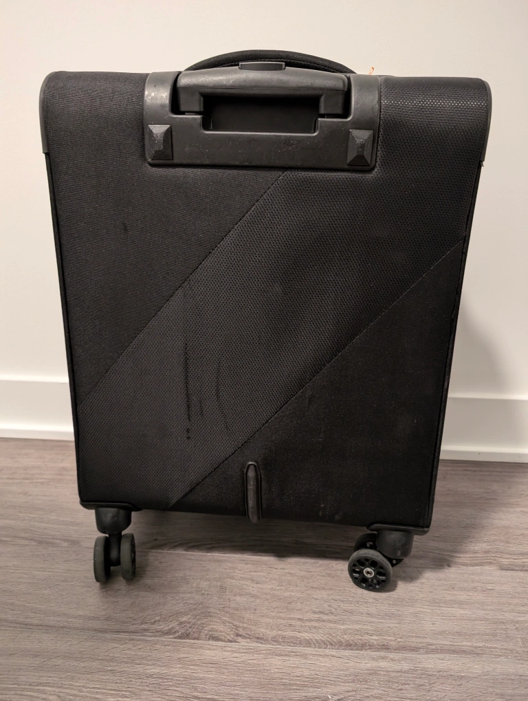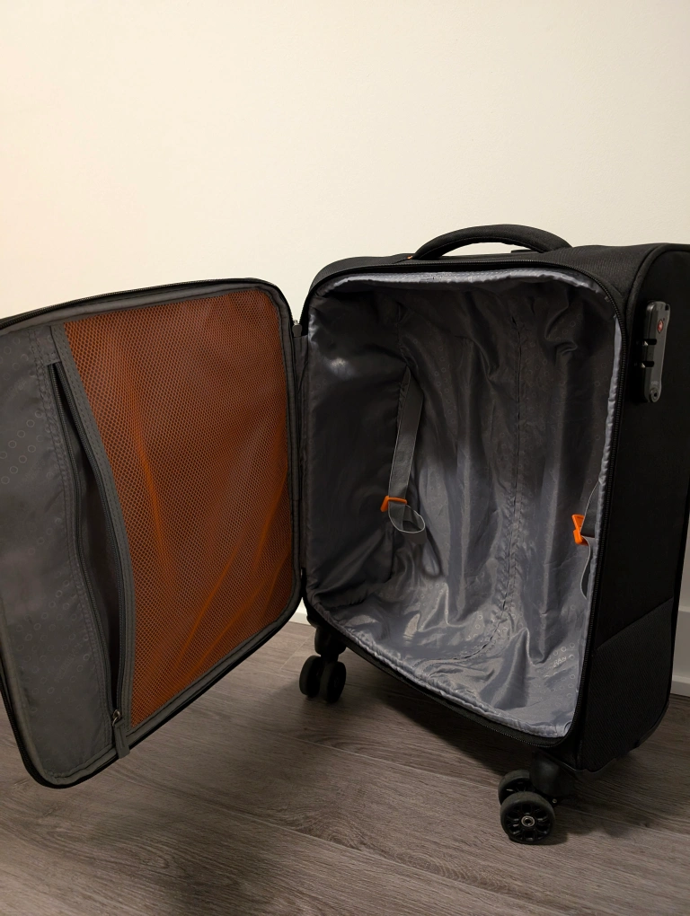 Black carry-on suitcase with four wheels and a combination lock. Has a built-in pocket on the front. Pull handle extends and retracts.