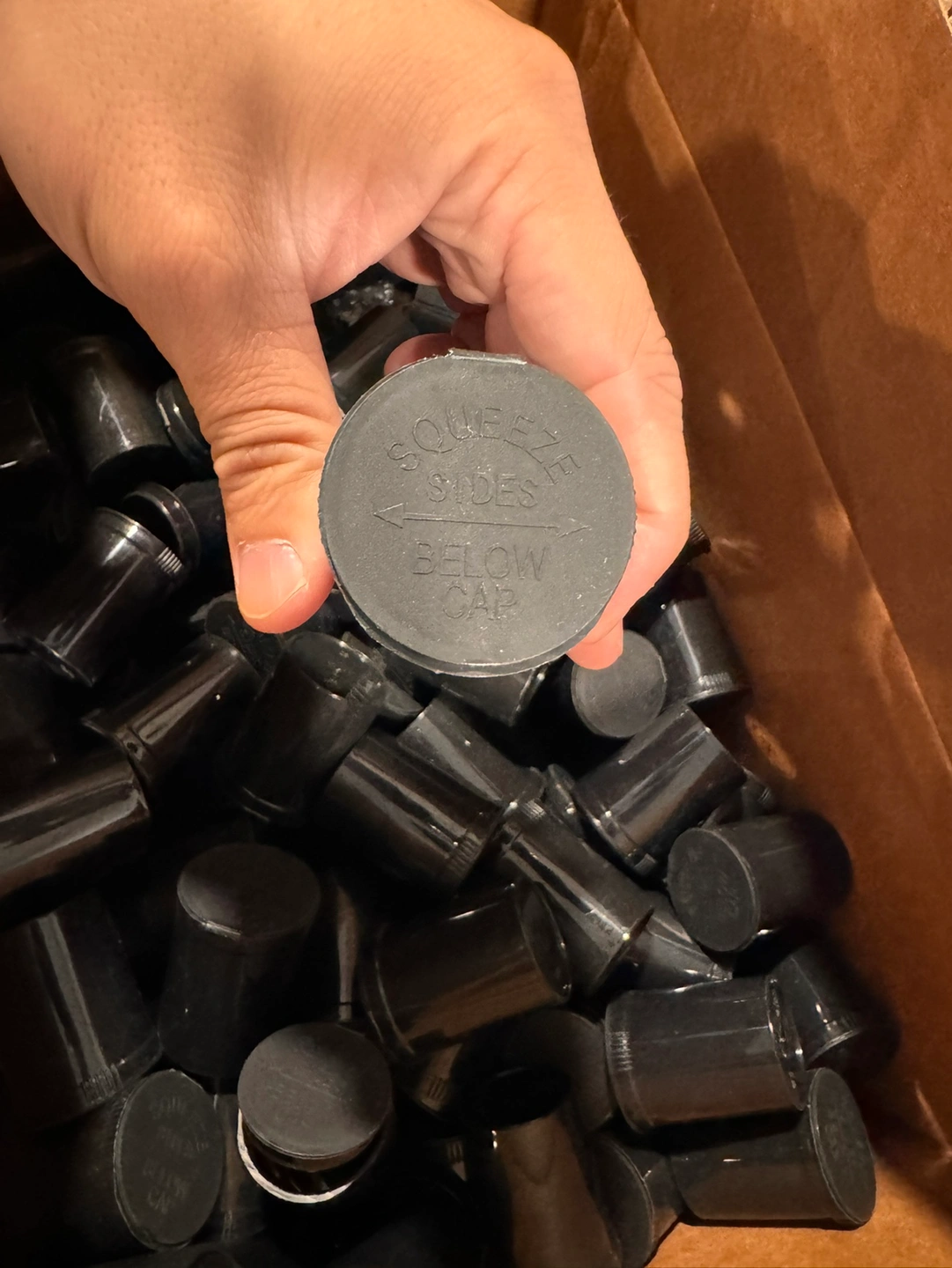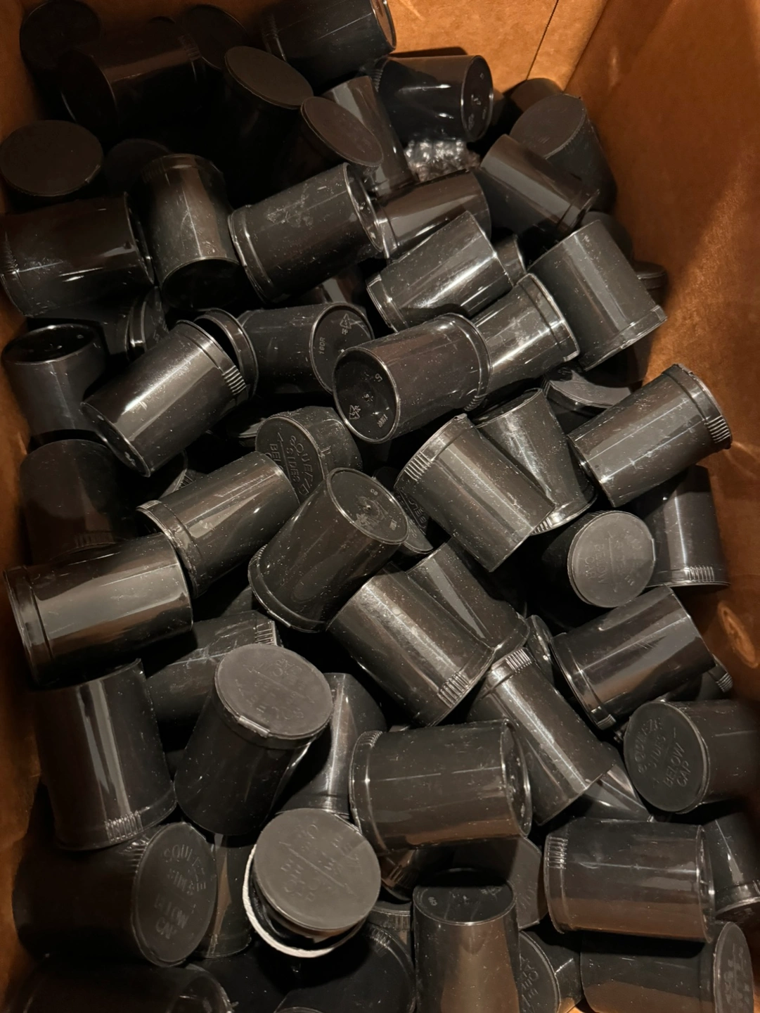 A box of 50 empty pill bottles. The bottles are black and white. They are all the same size. Also have Pint Sized Containers with lids would like to sell everything together as a lot