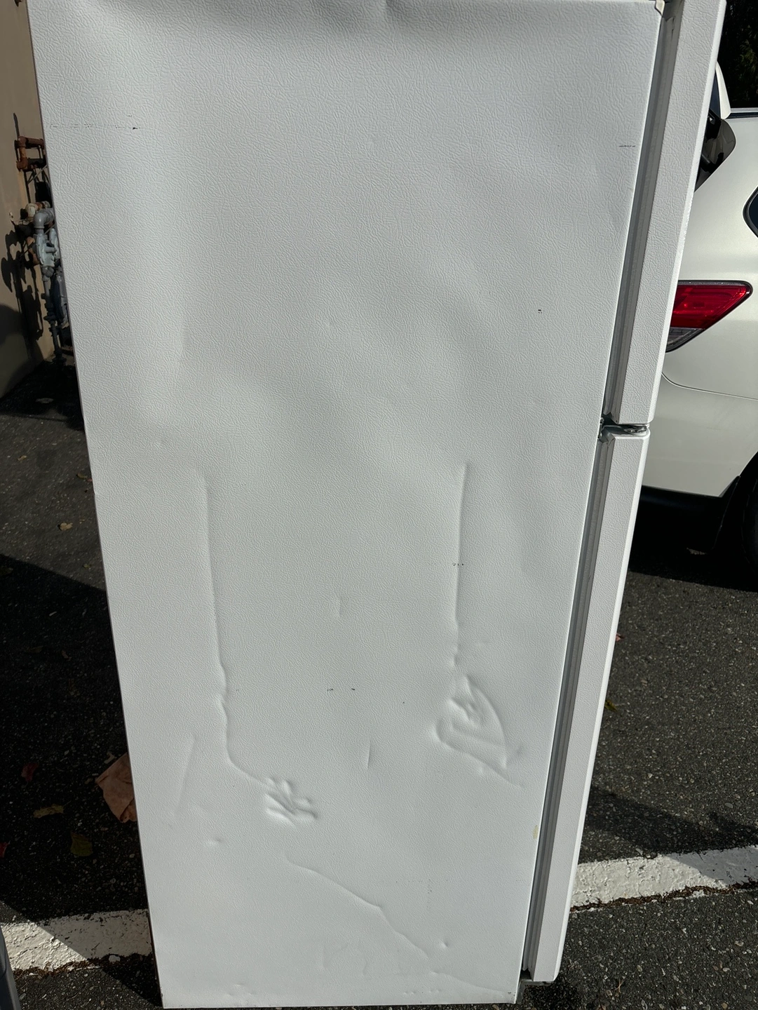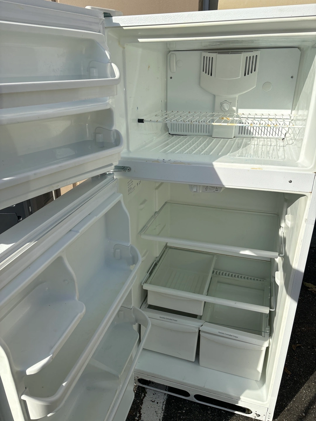 White top freezer refrigerator. Has ice maker and water dispenser. The freezer portion has one shelf and the fridge has two shelves and a crisper drawer. There is a light inside the freezer compartment. The fridge has three shelves, two crisper drawers and a door shelf. There are two small shelves on the door.