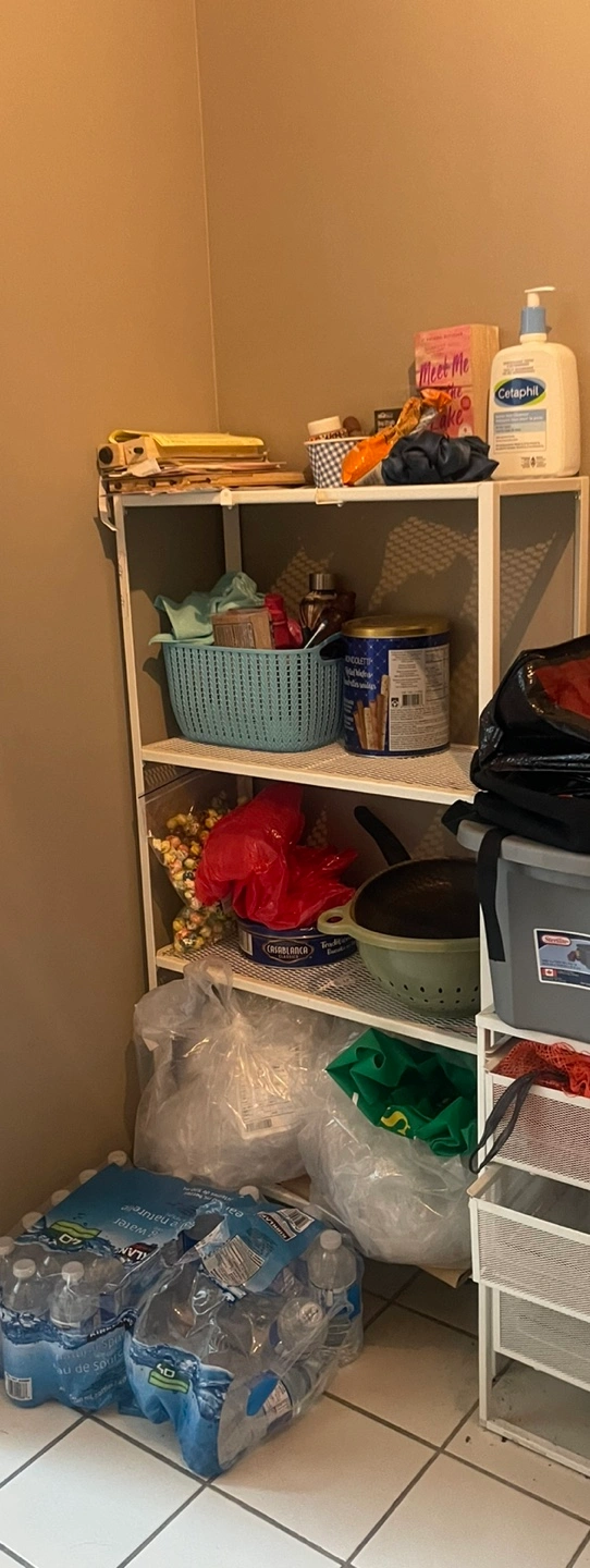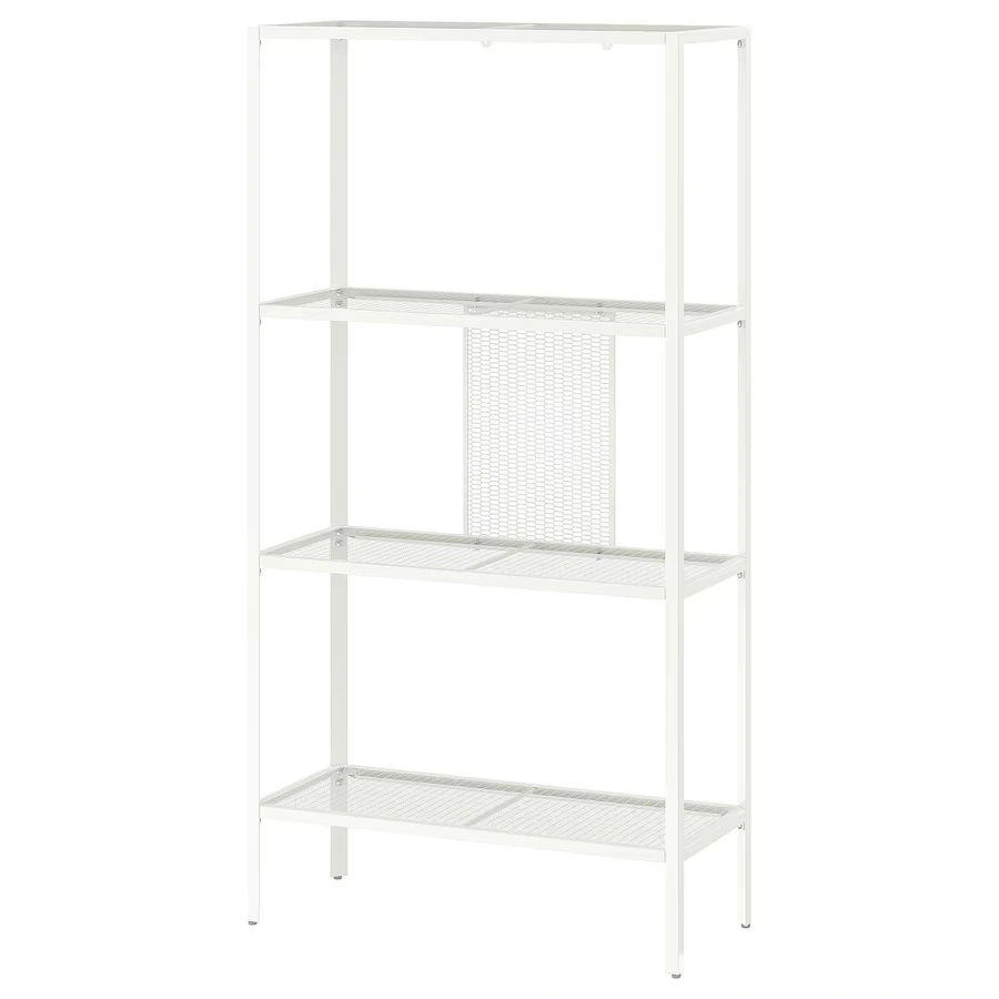 A four-shelf white metal shelving unit. The shelves are wire mesh. The unit measures 60 cm wide, 25 cm deep, and 116 cm high. It is in good condition.