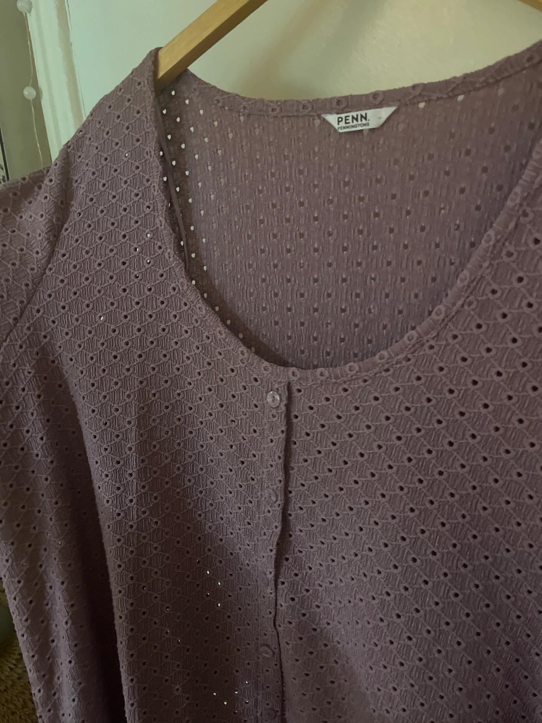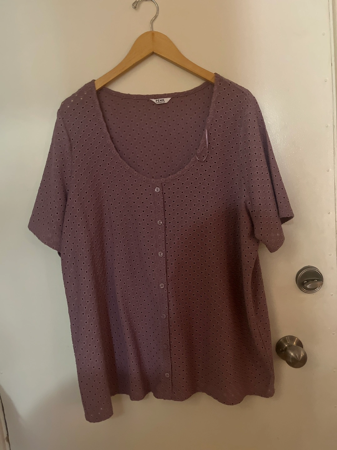 109Purple cotton blend blouse with short sleeves, eyelet detail throughout. Never worn. Smoke free home.