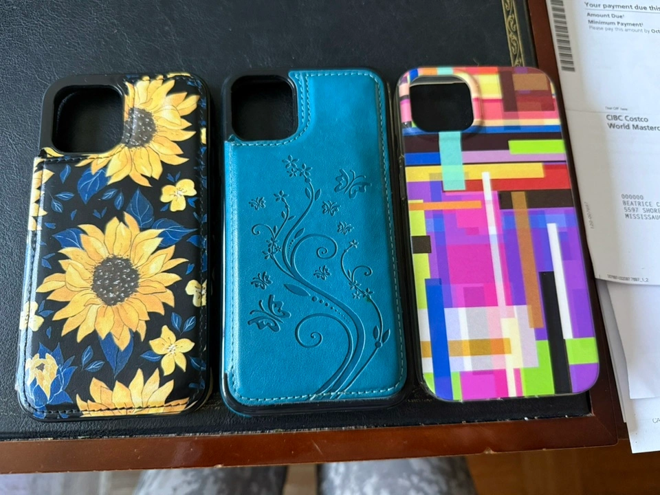 Three phone cases with different designs and colours. 2 are leather wallet cases with slots for cards and an ID pocket slot .