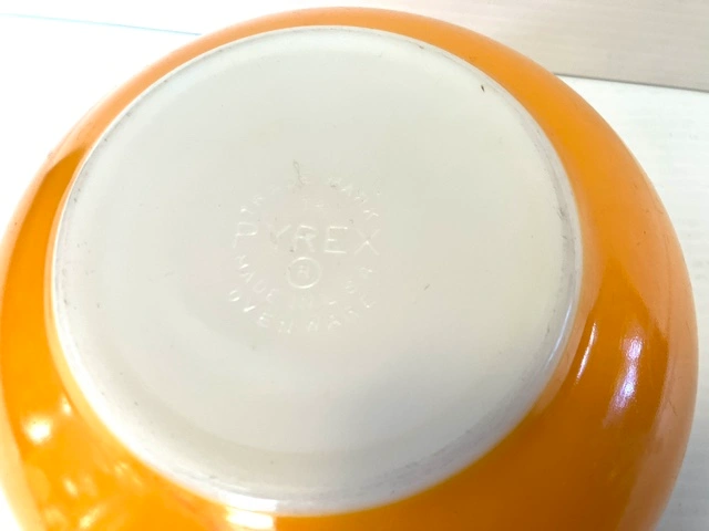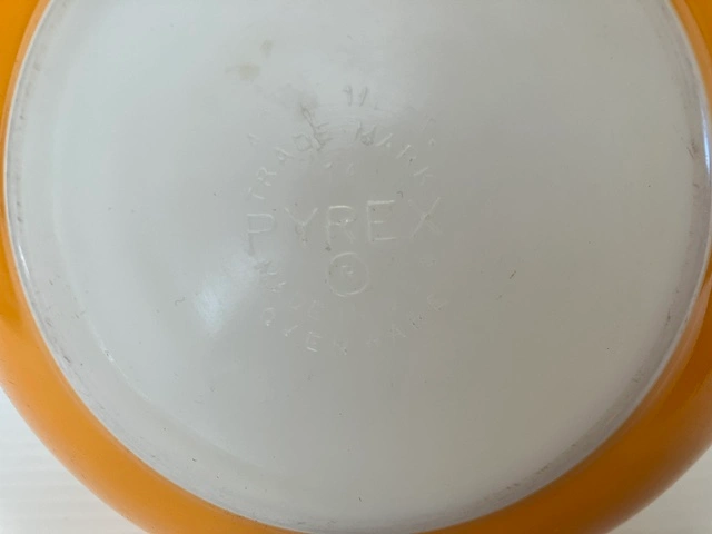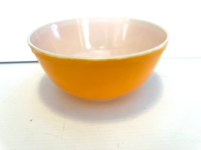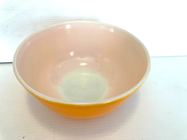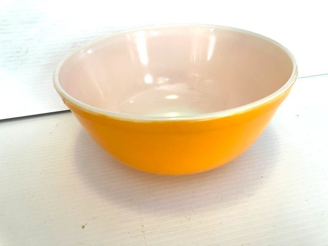 22Yellow mixing bowl, with white interior. Made in USA. The bowl is approximately 8 1/2 inches in diameter. It has some minor wear on side from going each other