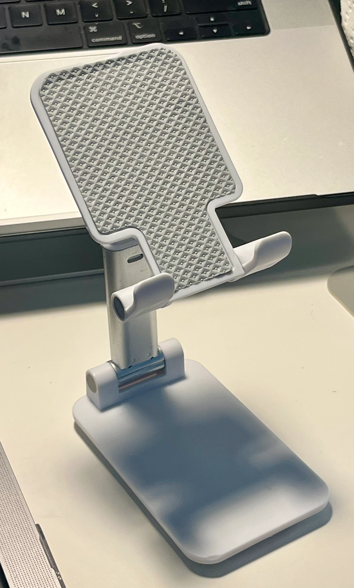 267A white folding phone stand with a grey non-slip surface. Check the link for details : https://a.co/d/aoyk29i