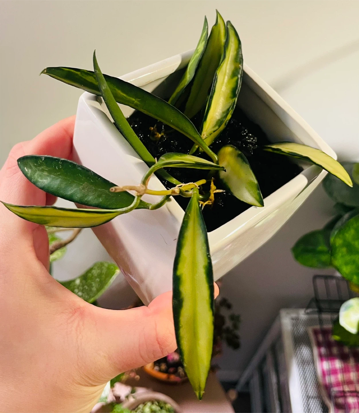 This is a variegated Hoya wayetti plant in a white pot. It features striking green and yellow striped leaves. This plant thrives in bright, indirect light.