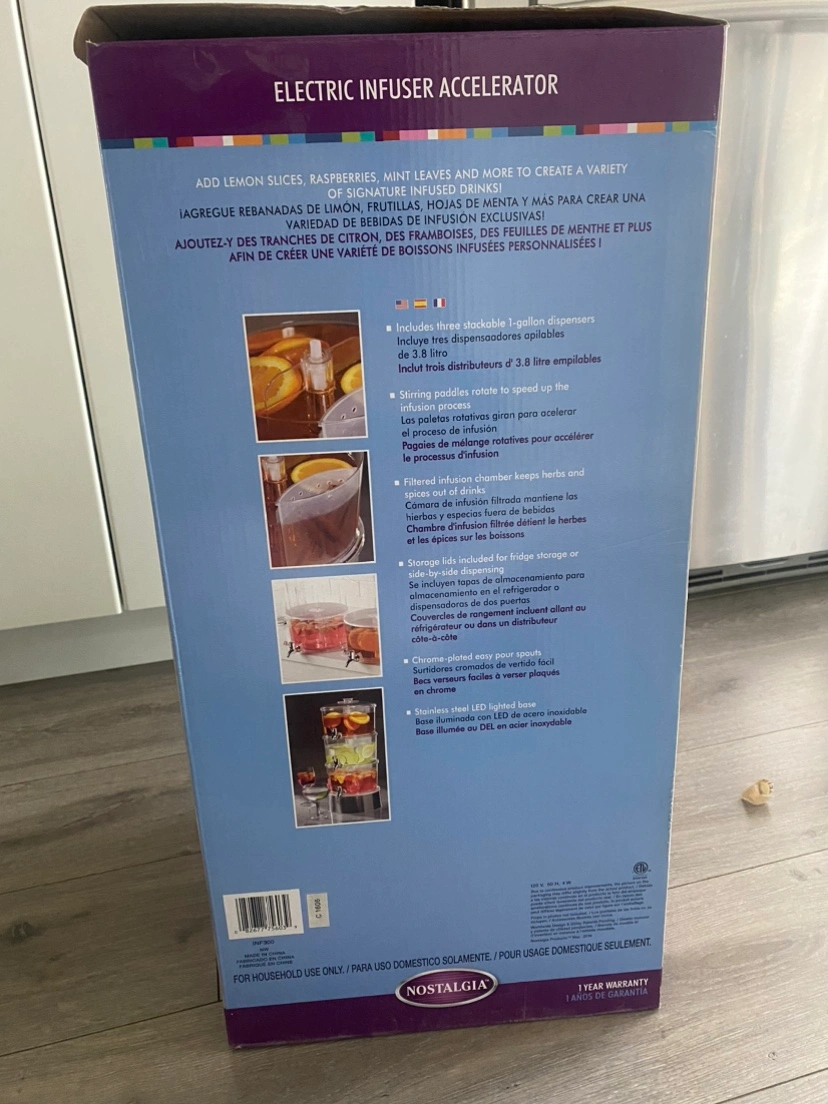 793 Gallon electric infuser with rotating paddles. Comes with storage lids for fridge storage or side-by-side dispensing. Features LED lights. Creates flavoured water, liquors, cocktails, and more! Stainless steel base. Easy to clean.