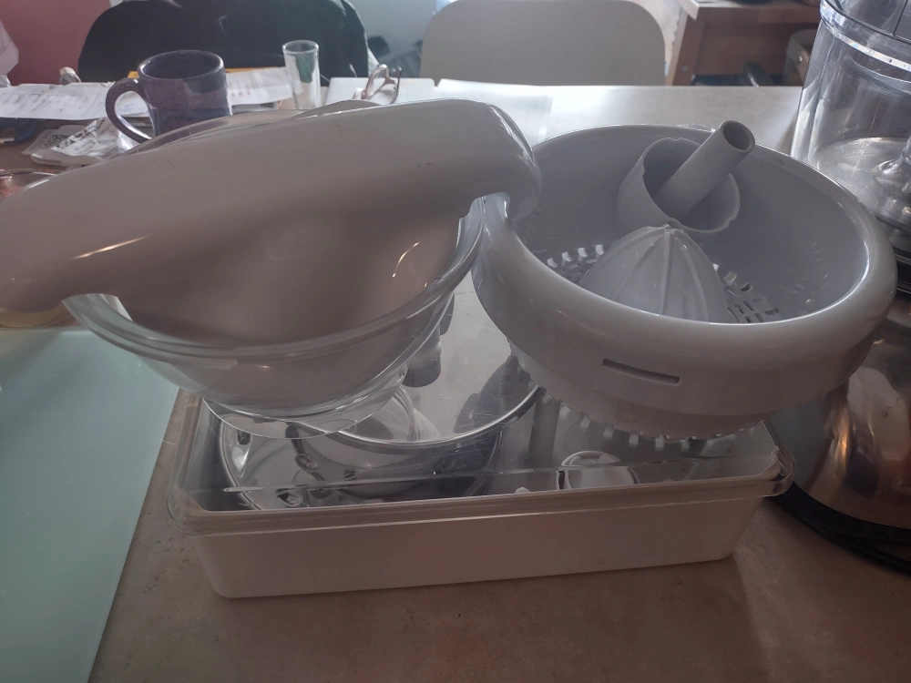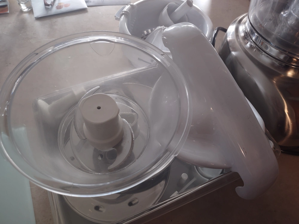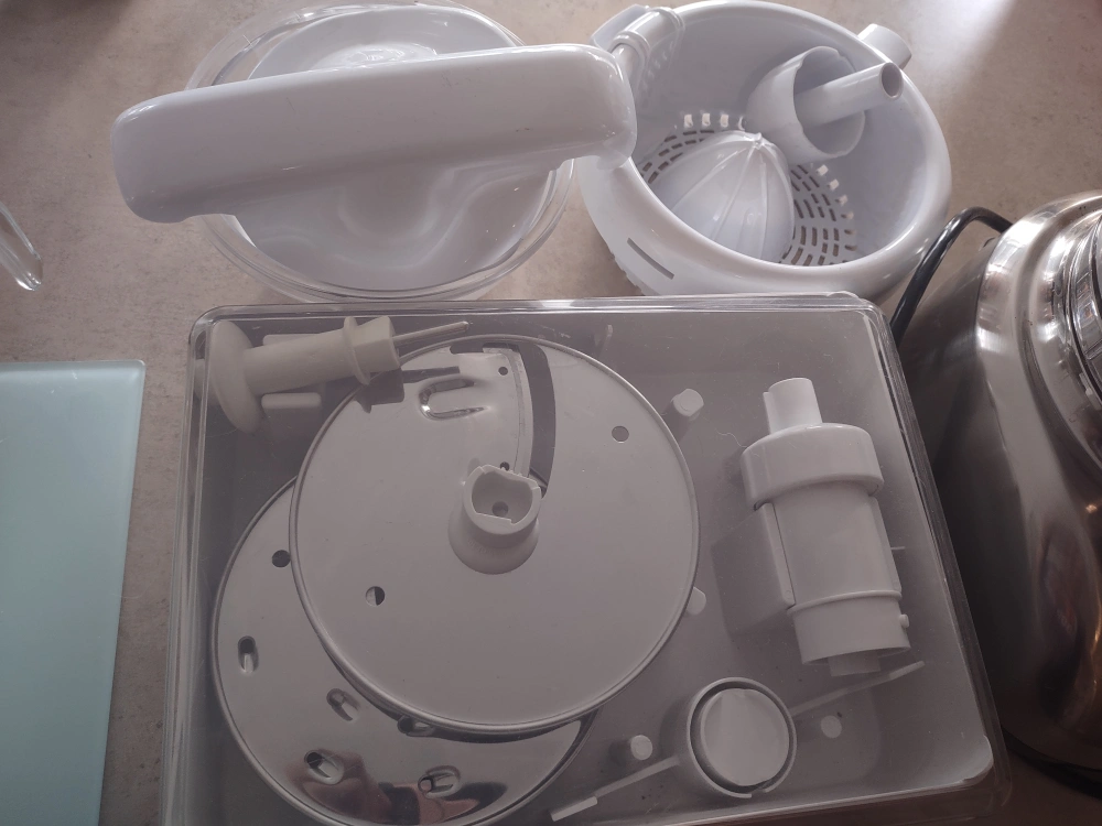Stainless steel, includes eggs shops, dough blade, 4 cup mini bowl and many other accessories.