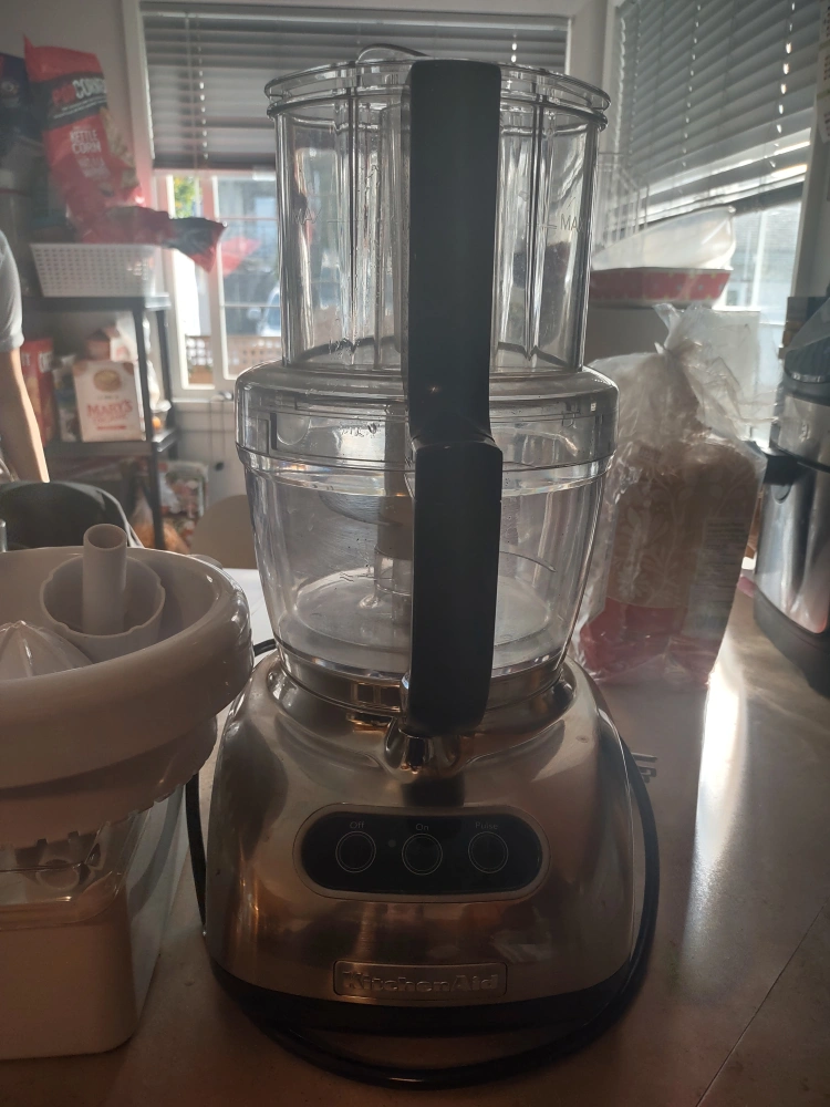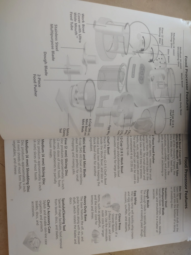Stainless steel, includes eggs shops, dough blade, 4 cup mini bowl and many other accessories.
