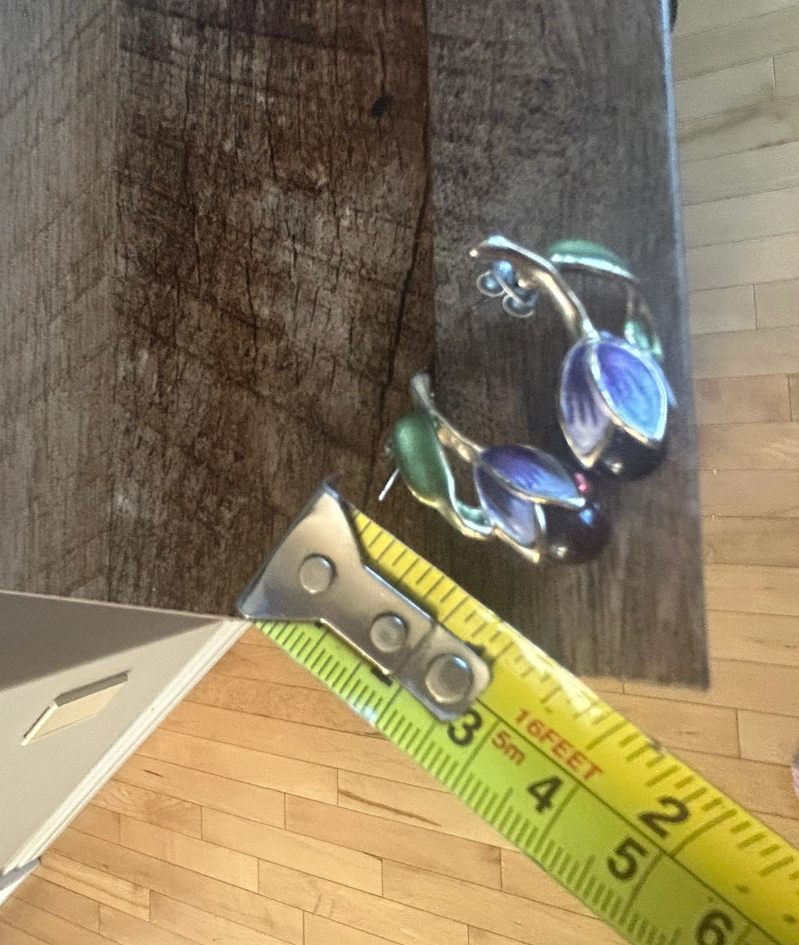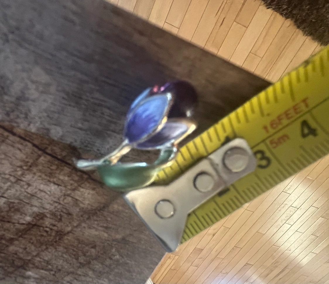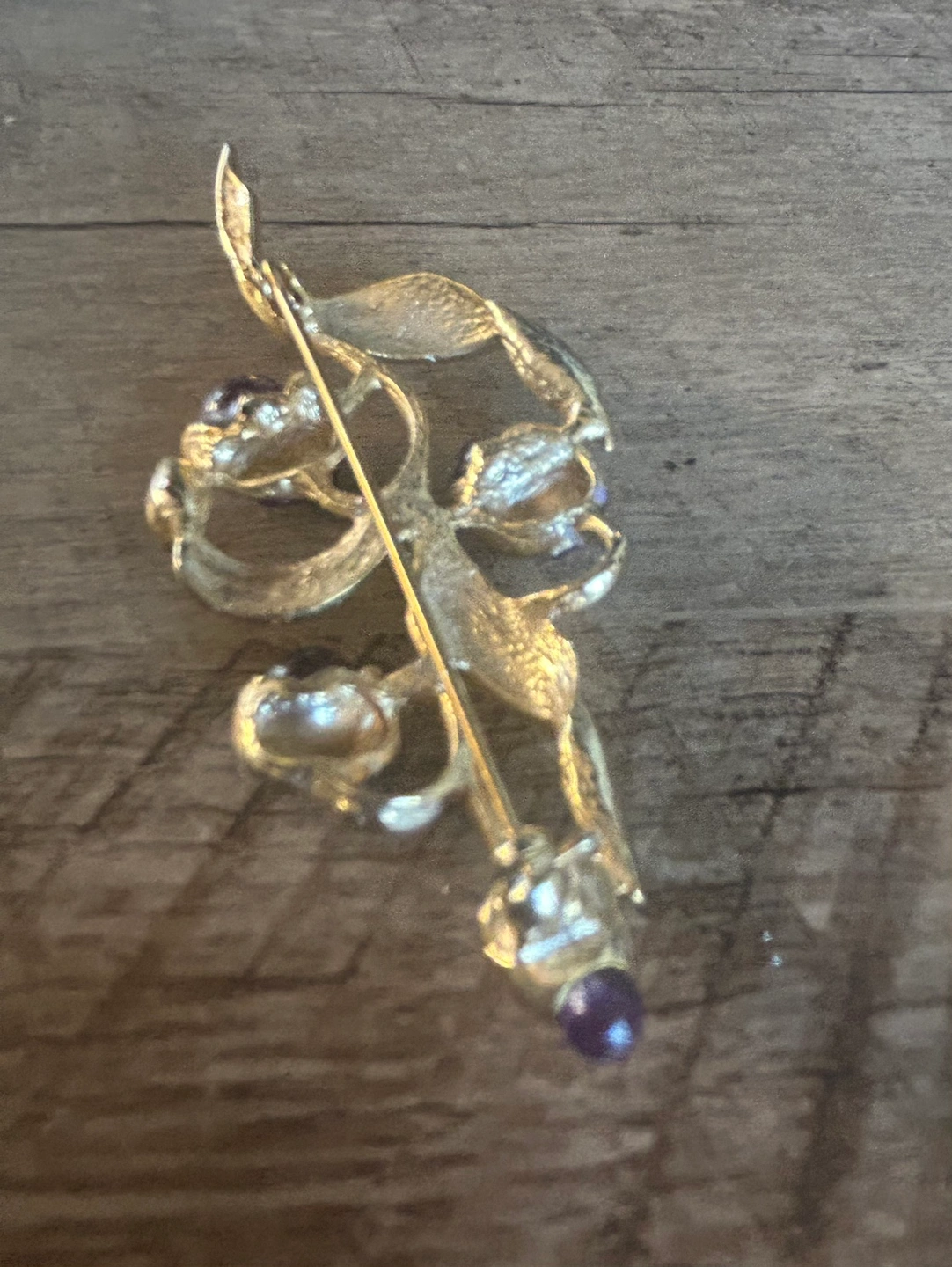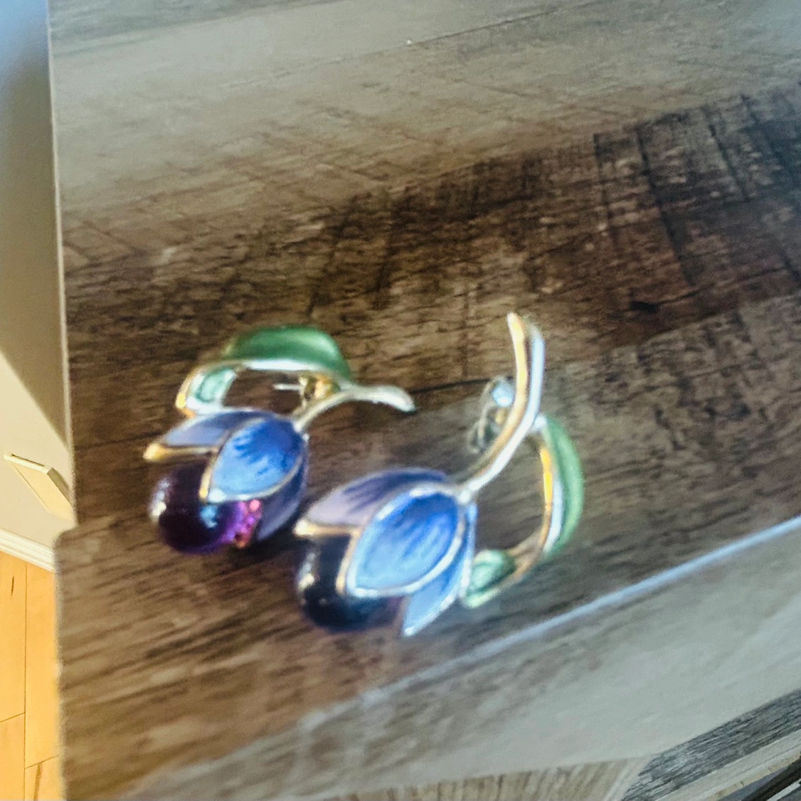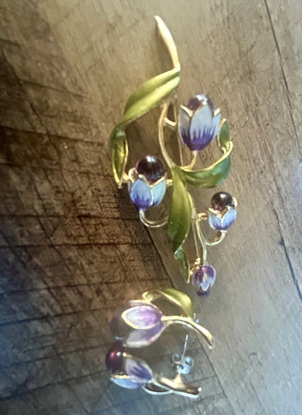 A gold-toned brooch with a tulip flower design. There are 3 flowers on the brooch, and it has a pin backing. One pair of earrings to complete the set.