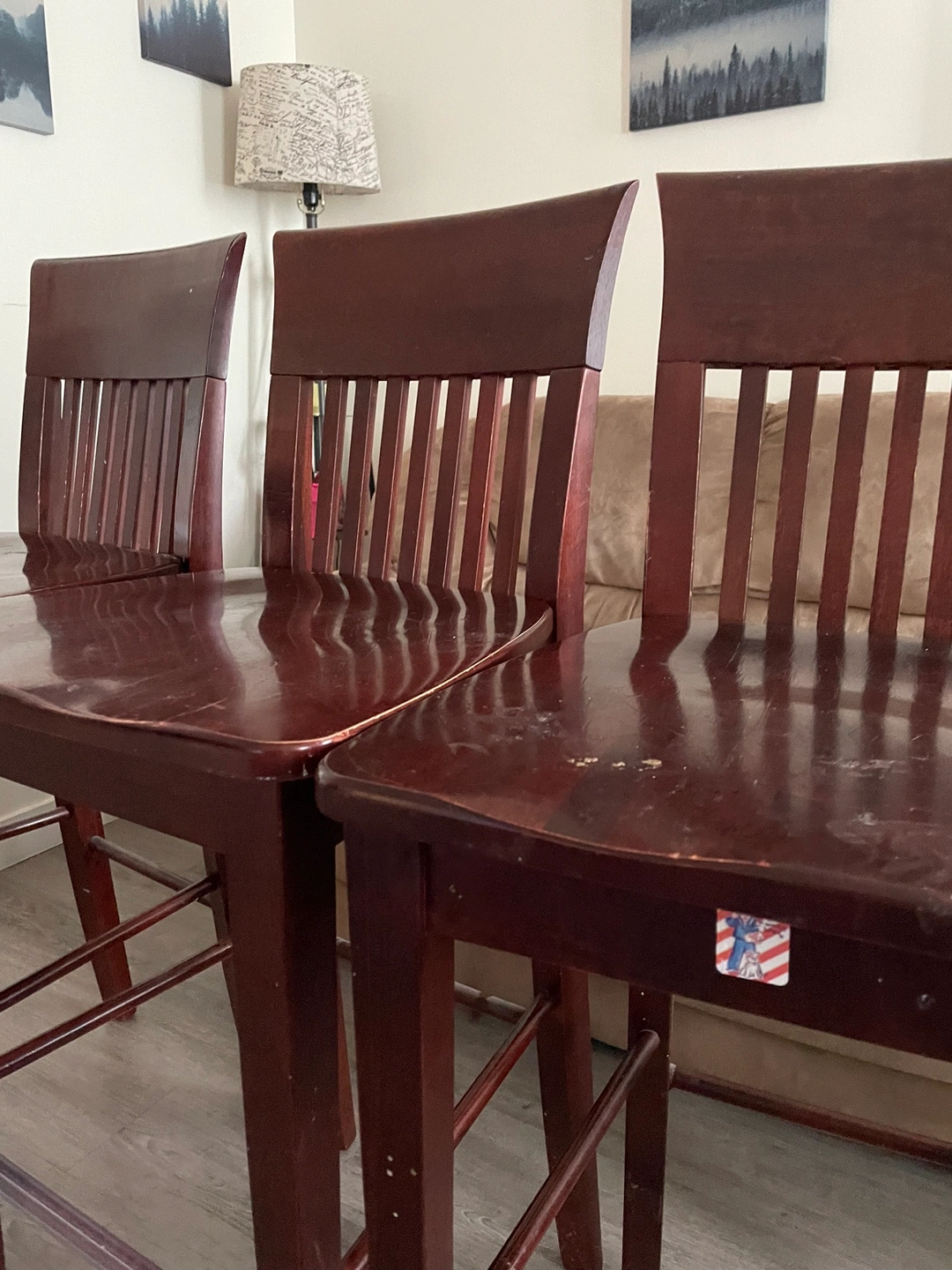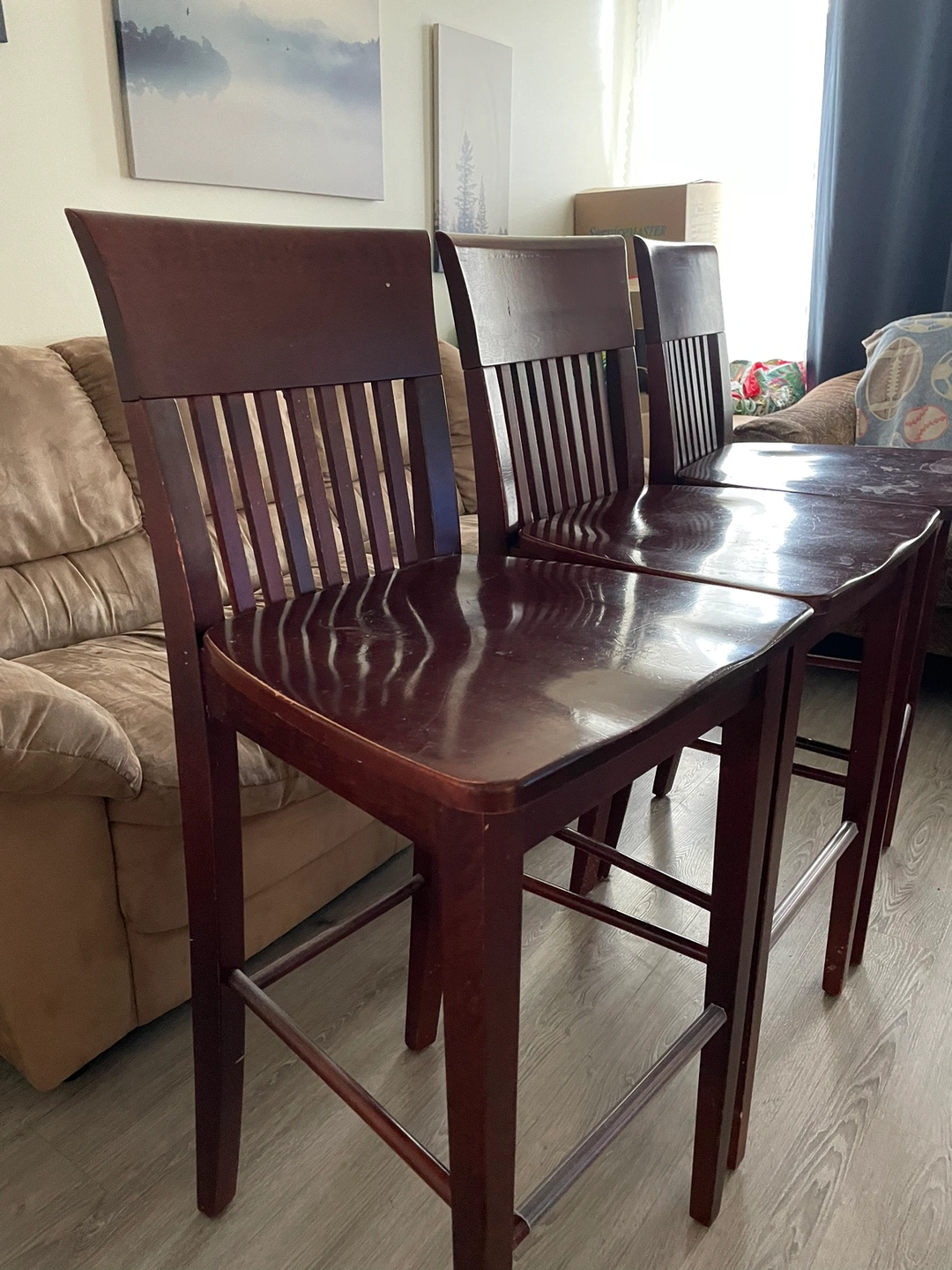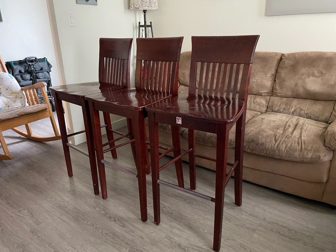 Three brown bar stools, each with a slatted back. The stools are solid wood and would be a great addition to your kitchen or dining room.