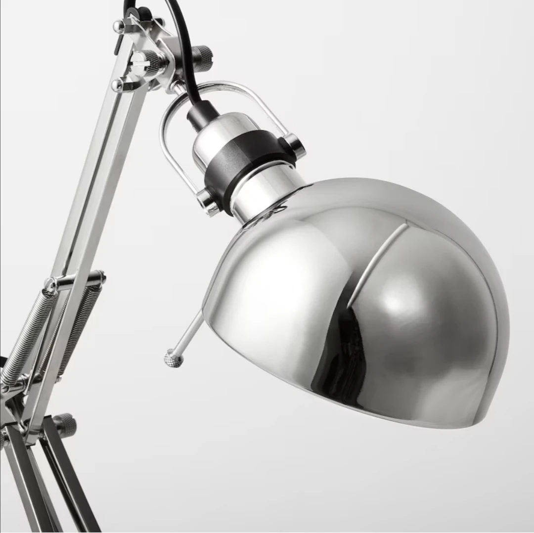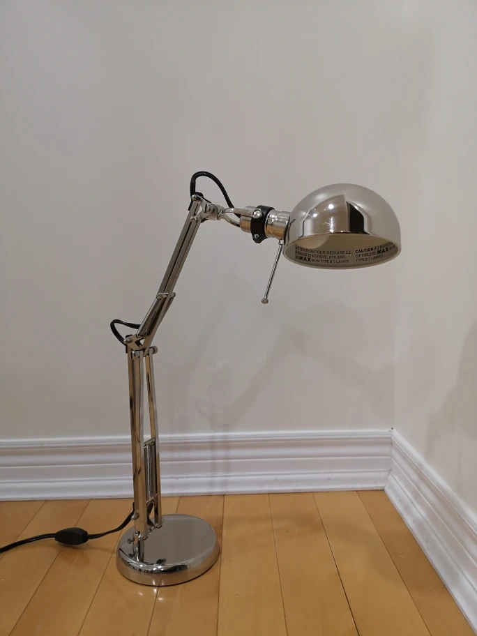 A chrome desk lamp with an adjustable arm and a dome-shaped shade.